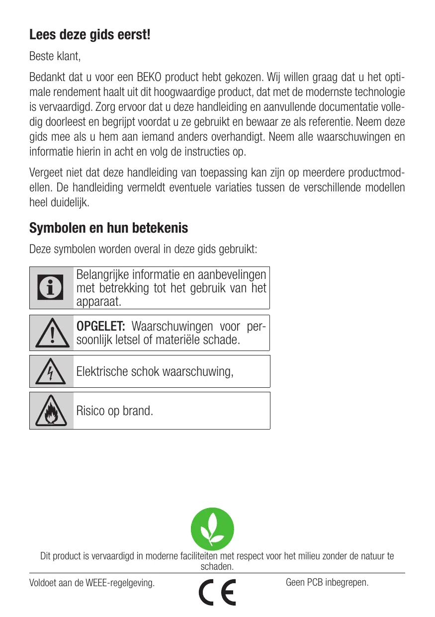 85 / BG Lees deze gids eerst! Beste klant, Bedankt dat u voor een BEKO product hebt gekozen. Wij willen graag dat u het optimale rendement haalt uit dit hoogwaardige product, dat met de modernste technologie is vervaardigd. Zorg ervoor dat u deze handleiding en aanvullende documentatie volledig doorleest en begrijpt voordat u ze gebruikt en bewaar ze als referentie. Neem deze gids mee als u hem aan iemand anders overhandigt. Neem alle waarschuwingen en informatie hierin in acht en volg de instructies op. Vergeet niet dat deze handleiding van toepassing kan zijn op meerdere productmodellen. De handleiding vermeldt eventuele variaties tussen de verschillende modellen heel duidelijk.