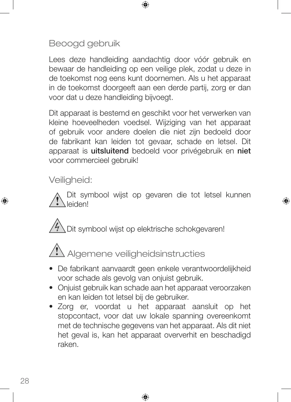 Beoogd gebruik Lees deze handleiding aandachtig door vóór gebruik en bewaar de handleiding op een veilige plek, zodat u deze in de toekomst nog eens kunt doornemen. Als u het apparaat in de toekomst doorgeeft aan een derde partij, zorg er dan voor dat u deze handleiding bijvoegt. Dit apparaat is bestemd en geschikt voor het verwerken van kleine hoeveelheden voedsel. Wijziging van het apparaat of gebruik voor andere doelen die niet zijn bedoeld door de fabrikant kan leiden tot gevaar, schade en letsel. Dit apparaat is uitsluitend bedoeld voor privégebruik en niet voor commercieel gebruik! Veiligheid: Dit symbool wijst op gevaren die tot letsel kunnen leiden! Dit symbool wijst op elektrische schokgevaren! Algemene veiligheidsinstructies
