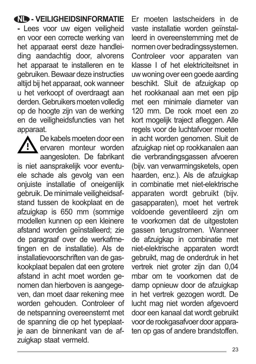 NL - VEILIGHEIDSINFORMATIE - Lees voor uw eigen veiligheid en voor een correcte werking van het apparaat eerst deze handleiding aandachtig door, alvorens het apparaat te installeren en te gebruiken. Bewaar deze instructies altijd bij het apparaat, ook wanneer u het verkoopt of overdraagt aan derden. Gebruikers moeten volledig op de hoogte zijn van de werking en de veiligheidsfuncties van het apparaat. De kabels moeten door een ervaren monteur worden aangesloten. De fabrikant is niet aansprakelijk voor eventuele schade als gevolg van een onjuiste installatie of oneigenlijk gebruik. De minimale veiligheidsafstand tussen de kookplaat en de afzuigkap is 650 mm (sommige modellen kunnen op een kleinere afstand worden geïnstalleerd; zie de paragraaf over de werkafmetingen en de installatie). Als de installatievoorschriften van de gaskookplaat bepalen dat een grotere afstand in acht moet worden genomen dan hierboven is aangegeven, dan moet daar rekening mee worden gehouden. Controleer of de netspanning overeenstemt met de spanning die op het typeplaatje aan de binnenkant van de afzuigkap staat vermeld.