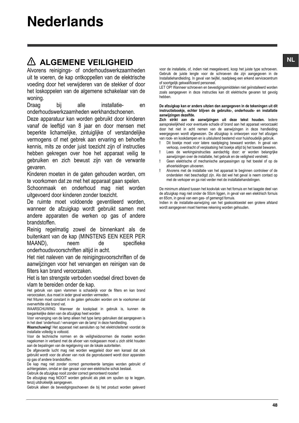 La pièce doit avoir une aération suffisante lorsque la hotte est utilisée conjointement avec d'autres appareils fonctionnant au gaz ou autres combustibles. La hotte doit être régulièrement nettoyée à la fois à l'intérieur et à l'extérieur (AU MOINS UNE FOIS PAR MOIS); cela devrait se faire en conformité avec les instructions d'entretien. Le non respect des instructions expressément fournies concernant le nettoyage de la hotte et des filtres peut provoquer des risques d'incendie. Ne pas flamber d’aliments sous la hotte.