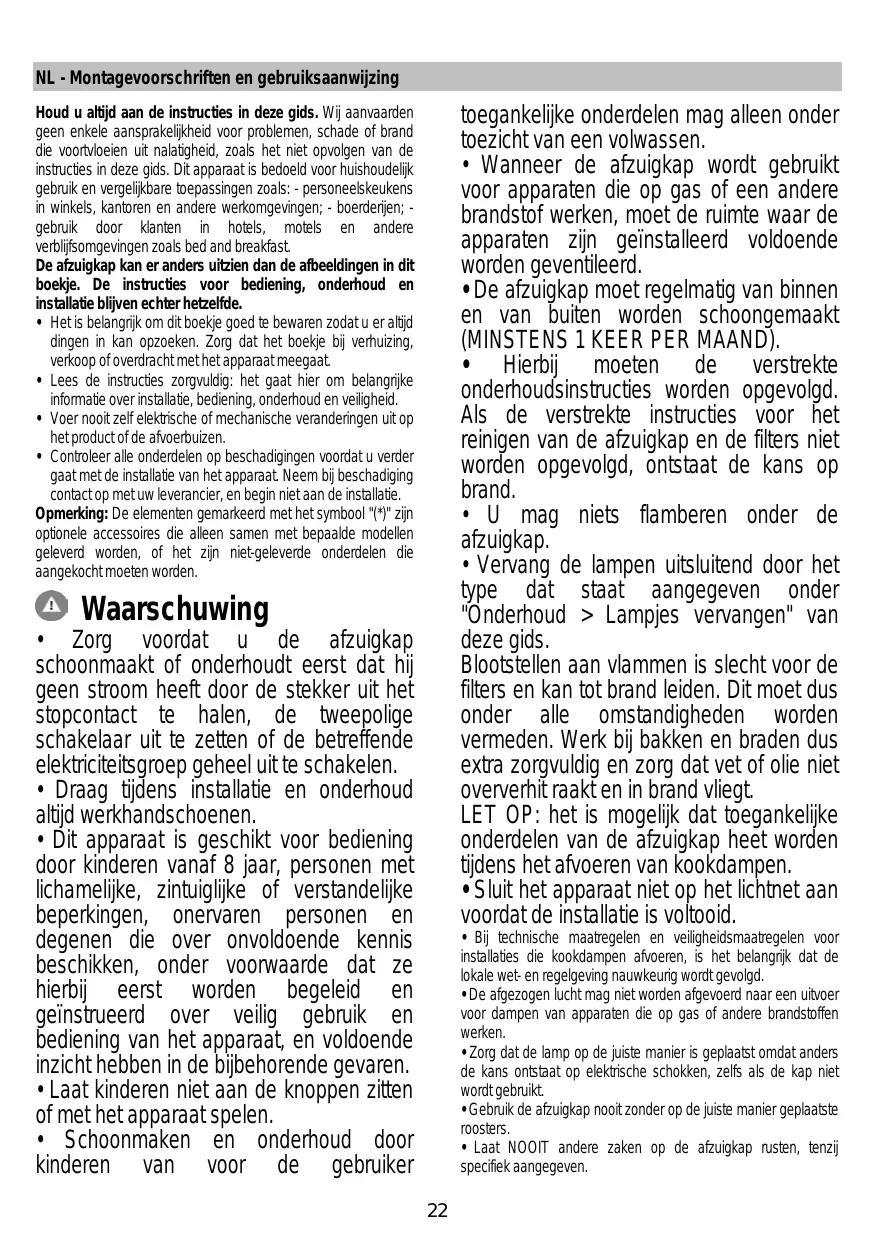 • La hotte doit être régulièrement nettoyée à la fois à l'intérieur et à l'extérieur (AU MOINS UNE FOIS PAR MOIS); cela devrait se faire en conformité avec les instructions d'entretien. Le non respect des instructions expressément fournies concernant le nettoyage de la hotte et des filtres peut provoquer des risques d'incendie. • Ne pas flamber d’aliments sous la hotte. • Pour le remplacement de la lampe, utilisez uniquement le type de lampe spécifié dans la section remplacement/maintenance lampe dans ce manuel. L'utilisation d'une flamme nue est dommageable pour les filtres et peut causer un incendie, par conséquent, il est déconseillé de l'utiliser. La friture doit être faite avec soin afin de s’assurer que l’huile surchauffée ne prenne pas feu. AVERTISSEMENT: Lorsque la table de cuisson est en fonctionnement, les parties accessibles de la hotte peuvent devenir très chaudes. • Ne pas brancher l'appareil au réseau électrique avant que l'installation ne soit complètement terminée.