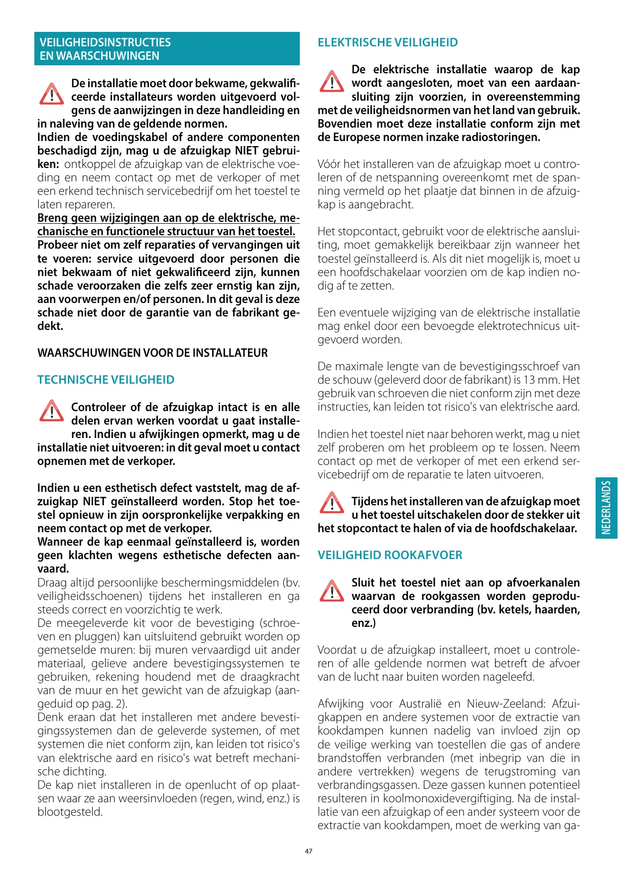 Avant d’effectuer l'installation de la hotte, lire attentivement le chap. « CONSIGNES DE SÉCURITÉ ET MISES EN GARDE ».