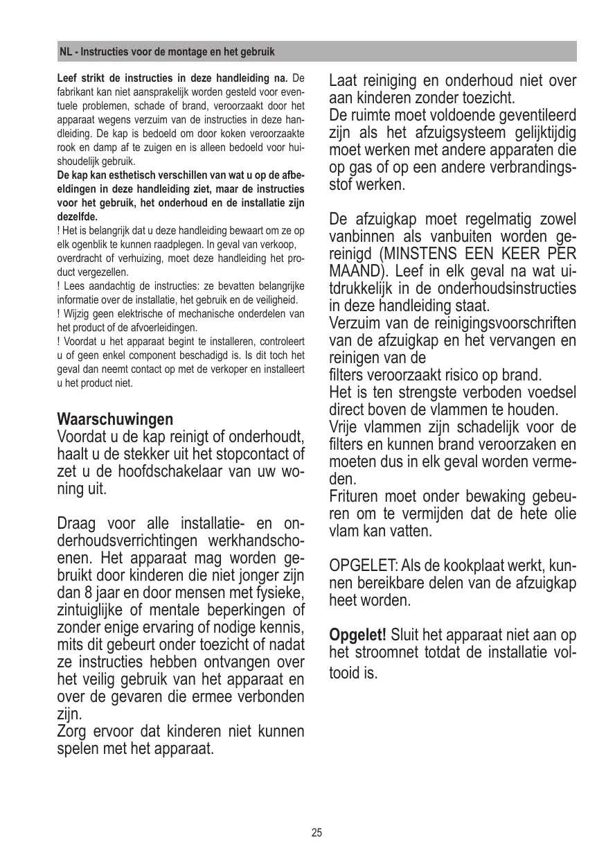 La hotte ne doit JAMAIS être utilisée comme un support, sauf indication contraire.