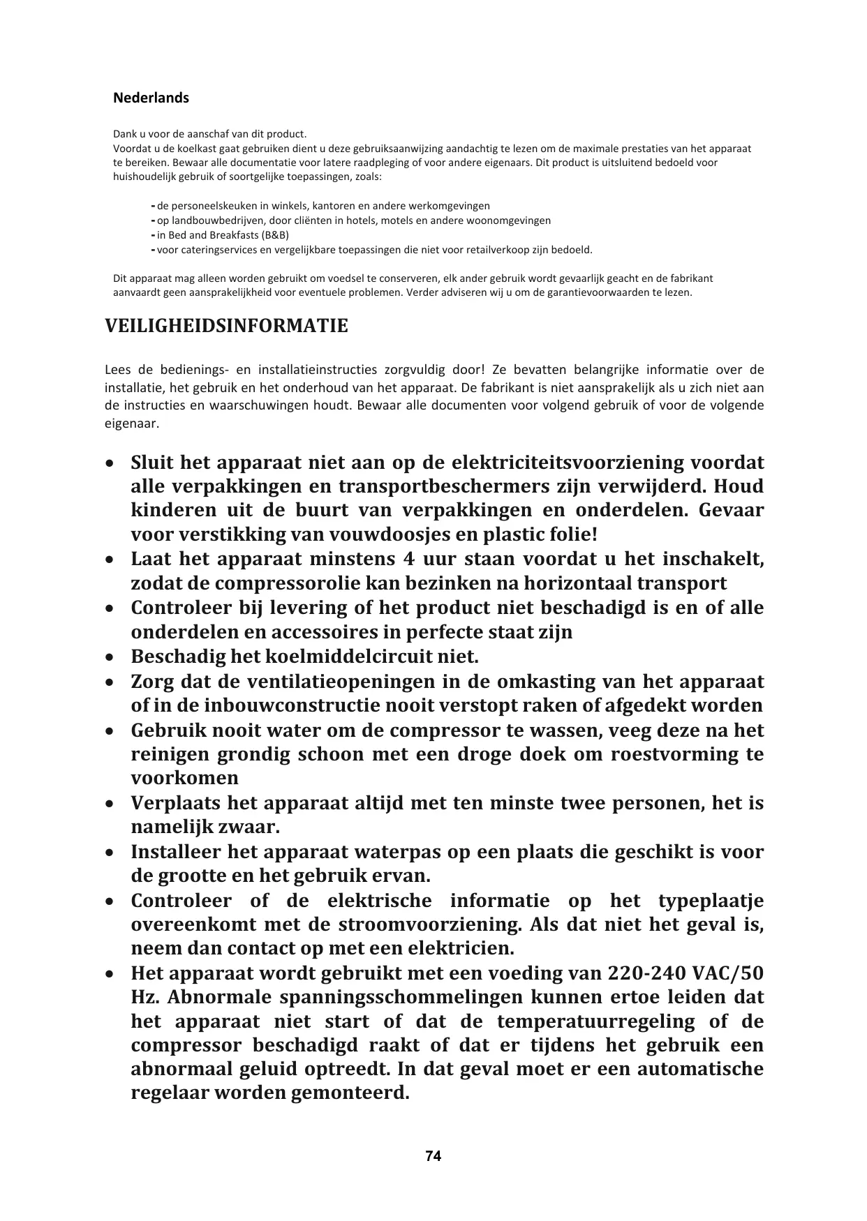 - dans les fermes-auberges, pour la clientèle des hôtels, motels et autres lieux de type résidentiel, - dans les chambres d'hôtes, - chez la restauration et autres services similaires, ce produit ne convient pas à la vente au détail. Cet appareil doit être utilisé uniquement pour conserver de la nourriture ; tout autre usage est considéré comme dangereux et le fabricant ne sera pas tenu responsable en cas de mauvaise utilisation. Il est donc recommandé de prendre connaissance des conditions de garantie.