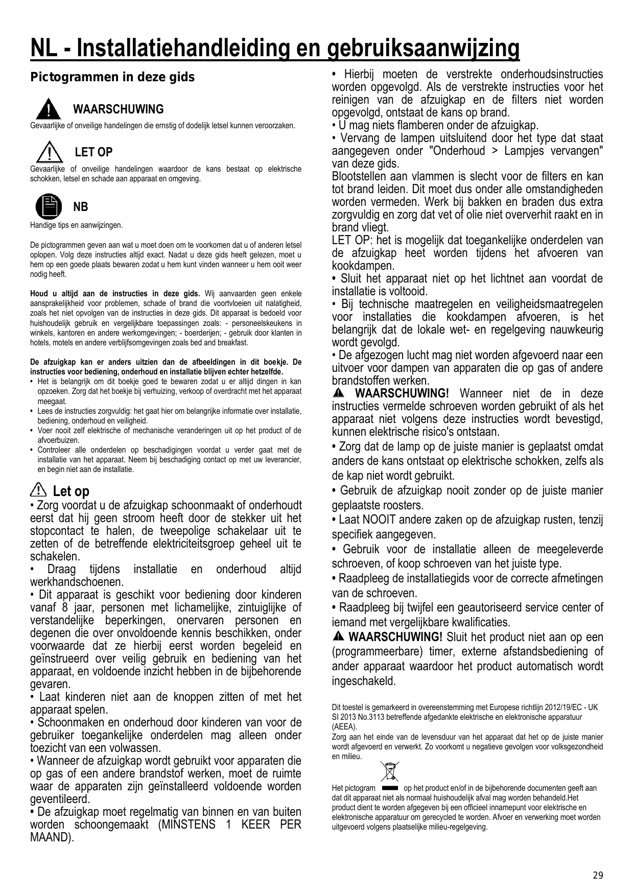 EN Instruction on mounting and use NL Installatiehandleiding en gebruiksaanwijzing PT Instruções para instalação e utilização RU Инструкция по монтажу и эксплуатации UK Інструкція з монтажу та експлуатації • No conectar la unidad a la red eléctrica hasta que la instalación sea totalmente completada. • En cuanto a las medidas técnicas y de seguridad a adoptar para la descarga de los humos, seguir estrictamente lo previsto por los reglamentos de las autoridades locales competentes. • El aire aspirado no debe ser transportado en un conducto usado para la descarga de humos producidos por dispositivos de combustión a gas u otros combustibles. ¡ATENCIÓN! Si no se instalan los tornillos y elementos de fijación de acuerdo con estas instrucciones se puede incurrir en riesgos de naturaleza eléctricos. • No utilizar ni dejar la campana sin las luces correctamente instaladas debido al posible riesgo de descarga eléctrica. • No utilizar nunca la campana sin la rejilla montada correctamente! • La campana NUNCA debe utilizarse como una superficie de apoyo a menos que así se indique específicamente. • Utilizar sólo los tornillos para fijación suministrados con el producto para su instalación, o, si no se suministran, comprar el tipo correcto de tornillos. Utilizar la longitud correcta para los tornillos que se identifican en la Guía de instalación. • En caso de duda, consultar el centro de asistencia autorizado o un similar personal calificado. ¡ATENCIÓN! No utilizar con un programador, temporizador, mando a distancia separado o cualquier otro dispositivo que se active automáticamente. Este aparato lleva el marcado CE en conformidad con la Directiva 2012/19/EC - UK SI 2013 No.3113 del Parlamento Europeo y del Consejo sobre residuos de aparatos eléctricos y electrónicos (RAEE). La correcta eliminación de este producto evita consecuencias negativas para el medioambiente y la salud.