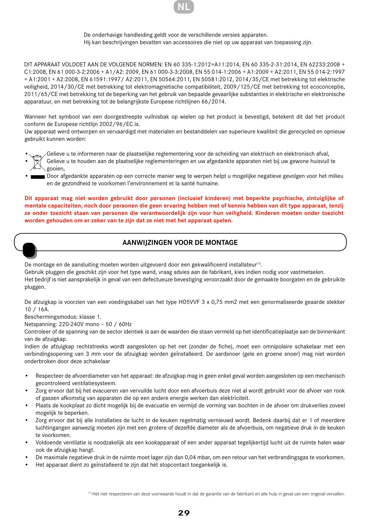 EN 60 335-1:2012+A11:2014, EN 60 335-2-31:2014, EN 62233:2008 + C1:2008, EN 61 000-3-2:2006 + A1/A2: 2009, EN 61 000-3-3:2008, EN 55 014-1:2006 + A1:2009 + A2:2011, EN 55 014-2:1997 + A1:2001 + A2:2008, EN 61591:1997/ A2:2011, EN 50564:2011, EN 50581:2012, 2014/35/CE relative à la sécurité électrique, 2014/30/CE relative à la compatibilité électromagnétique, 2009/125/CE relative à l’écoconception, 2011/65/CE relative à la limitation de l’utilisation de certaines substances dangereuses dans les équipements électriques et électroniques, et aux principales exigences des directives européennes 66/2014. Lorsque le symbole d’une poubelle à roue barrée est attaché à un produit, cela signifie que le produit est couvert par la directive Européenne 2002/96/EC. Votre produit est conçu et fabriqué avec des matériaux et des composants de haute qualité qui peuvent être recyclés et utilisés de nouveau : • • Cet appareil ne doit pas être utilisé par des personnes (y compris les enfants) ayant des capacités psychiques, sensorielles ou mentales réduites, ni par des personnes n’ayant pas l’expérience et la connaissance de ce type d’appareils, à moins d’être sous le contrôle et la formation de personnes responsables de leur sécurité. Les enfants doivent être surveillés pour s’assurer qu’ils ne jouent pas avec l’appareil.
