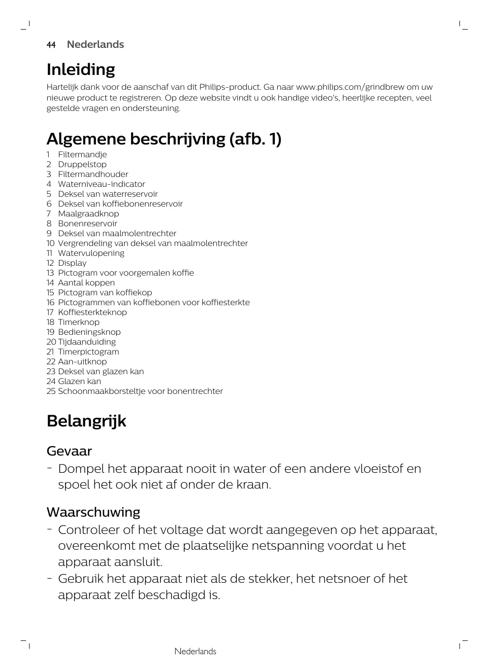 - Les enfants ne doivent pas jouer avec l'appareil. - Pour éviter tout risque ou blessure, n'utilisez pas cet appareil à d'autres fins que celles pour lesquelles il a été conçu. - Ne laissez pas le cordon pendre de la table ou du plan de travail sur lequel l'appareil est posé. - Ne versez jamais d’eau dans le réservoir à grains, car vous risqueriez d’endommager l’appareil. - Ne touchez pas aux meules de l’appareil, surtout lorsque ce dernier est branché. - Ne touchez pas les surfaces chaudes de l’appareil pendant son fonctionnement. - Ne videz pas le réservoir d’eau en inclinant l’appareil, vous risqueriez d’endommager ce dernier. Pour vider l’appareil, suivez les instructions de rinçage (voir 'Rinçage de l’appareil'). - Si vous ne parvenez pas à résoudre un problème à l’aide de ce mode d’emploi, contactez le Service Consommateurs Philips de votre pays. Si le problème persiste, confiez votre appareil à un Centre Service Agréé Philips pour vérification ou réparation. N’essayez jamais de réparer l’appareil vous-même, toute intervention entraîne l’annulation de votre garantie.