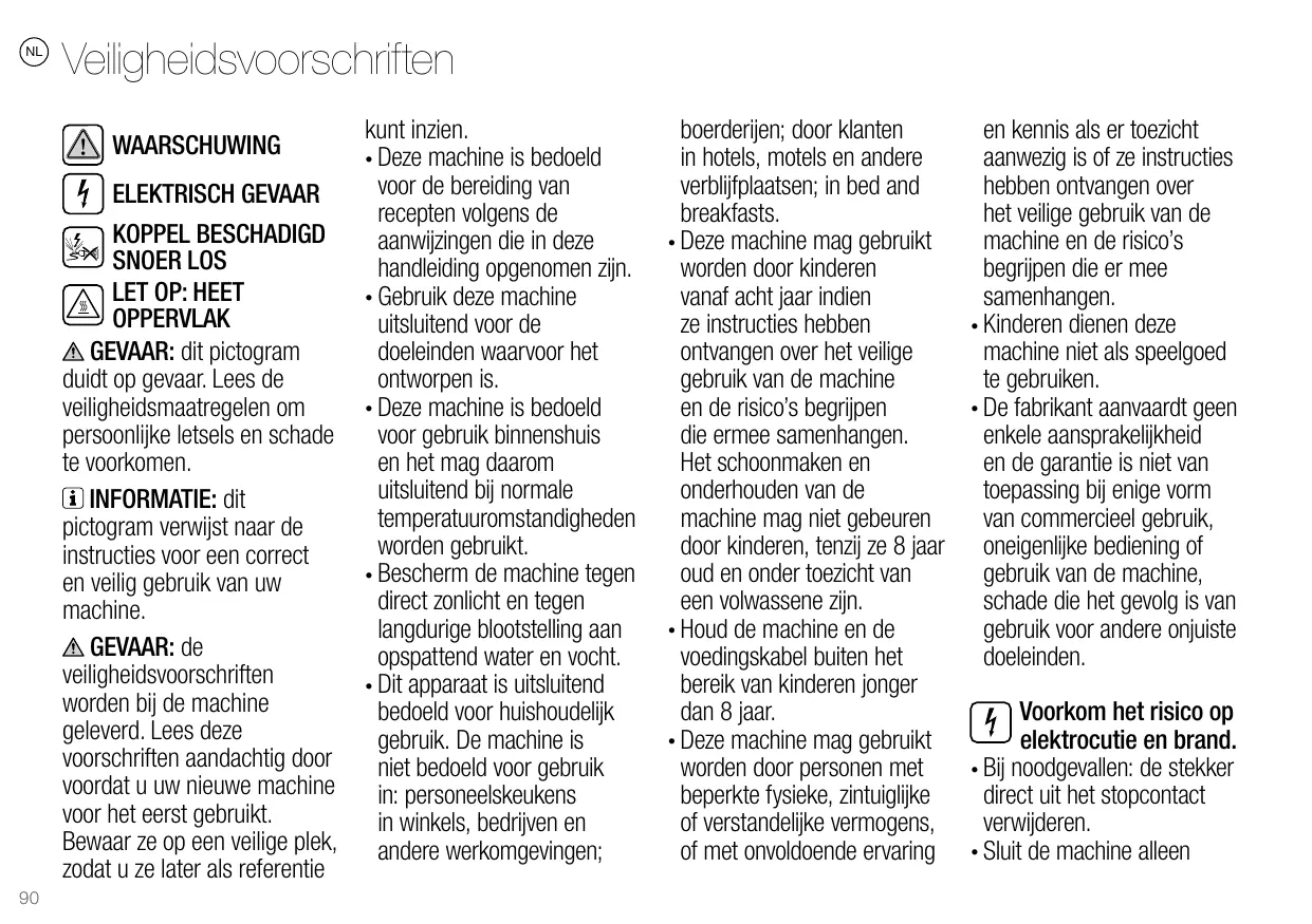 NL Veiligheidsvoorschriften WAARSCHUWING ELEKTRISCH GEVAAR KOPPEL BESCHADIGD SNOER LOS LET OP: HEET OPPERVLAK GEVAAR: dit pictogram duidt op gevaar. Lees de veiligheidsmaatregelen om persoonlijke letsels en schade te voorkomen. INFORMATIE: dit pictogram verwijst naar de instructies voor een correct en veilig gebruik van uw machine. GEVAAR: de veiligheidsvoorschriften worden bij de machine geleverd. Lees deze voorschriften aandachtig door voordat u uw nieuwe machine voor het eerst gebruikt. Bewaar ze op een veilige plek, zodat u ze later als referentie