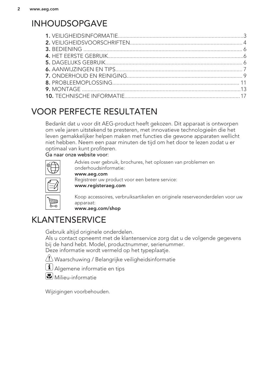 KLANTENSERVICE Gebruik altijd originele onderdelen. Als u contact opneemt met de klantenservice zorg dat u de volgende gegevens bij de hand hebt. Model, productnummer, serienummer. Deze informatie wordt vermeld op het typeplaatje. Waarschuwing / Belangrijke veiligheidsinformatie Algemene informatie en tips Milieu-informatie Wijzigingen voorbehouden.