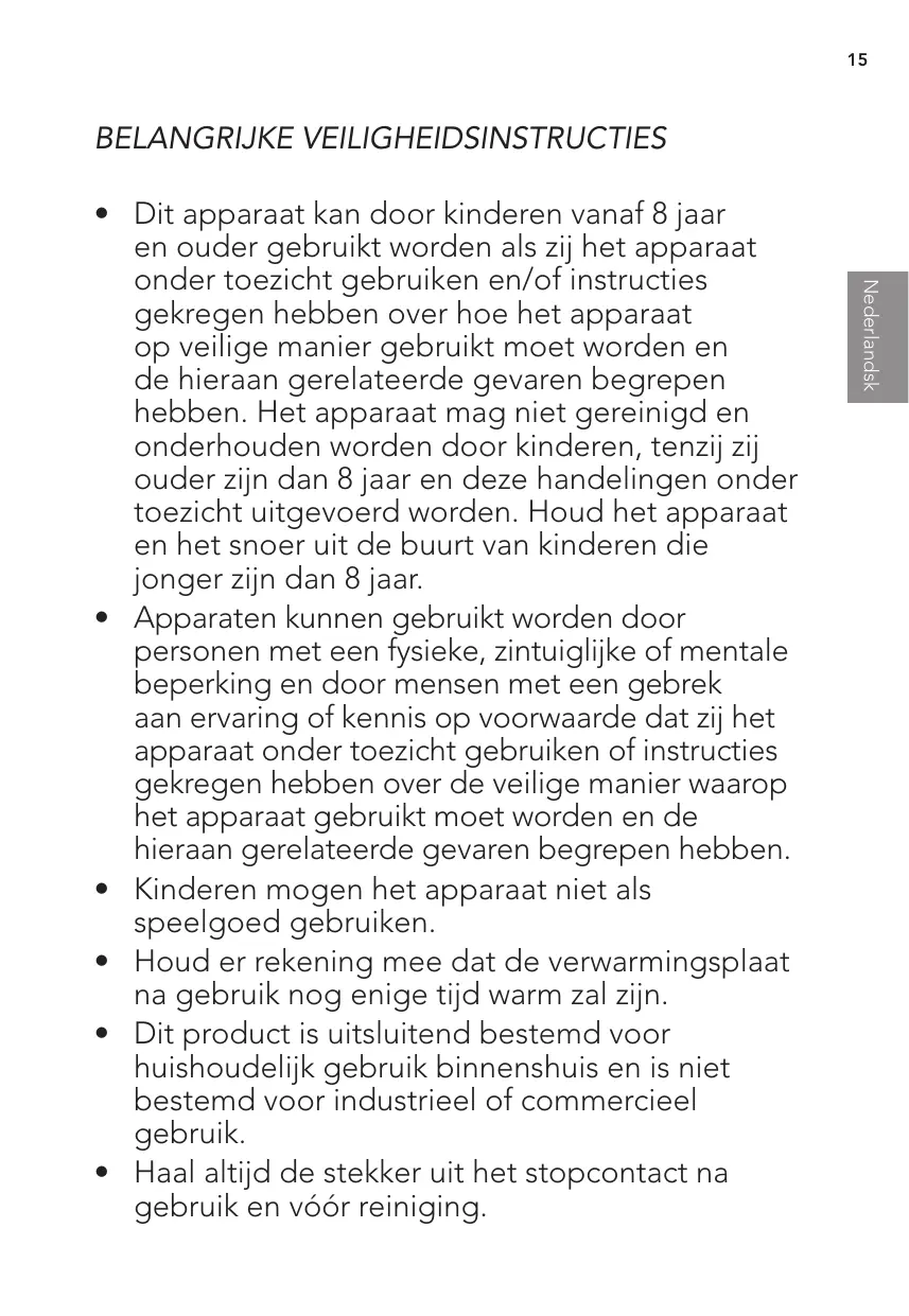 - Dit apparaat kan door kinderen vanaf 8 jaar en ouder gebruikt worden als zij het apparaat onder toezicht gebruiken en/of instructies gekregen hebben over hoe het apparaat op veilige manier gebruikt moet worden en de hieraan gerelateerde gevaren begrepen hebben. Het apparaat mag niet gereinigd en onderhouden worden door kinderen, tenzij zij ouder zijn dan 8 jaar en deze handelingen onder toezicht uitgevoerd worden. Houd het apparaat en het snoer uit de buurt van kinderen die jonger zijn dan 8 jaar.