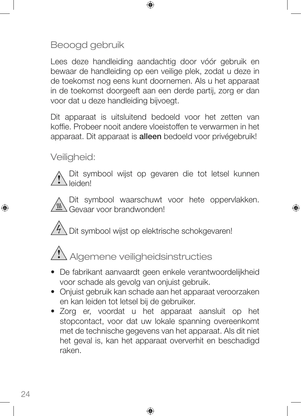 Beoogd gebruik Lees deze handleiding aandachtig door vóór gebruik en bewaar de handleiding op een veilige plek, zodat u deze in de toekomst nog eens kunt doornemen. Als u het apparaat in de toekomst doorgeeft aan een derde partij, zorg er dan voor dat u deze handleiding bijvoegt. Dit apparaat is uitsluitend bedoeld voor het zetten van koffie. Probeer nooit andere vloeistoffen te verwarmen in het apparaat. Dit apparaat is alleen bedoeld voor privégebruik! Veiligheid: Dit symbool wijst op gevaren die tot letsel kunnen leiden! Dit symbool waarschuwt voor hete oppervlakken. Gevaar voor brandwonden! Dit symbool wijst op elektrische schokgevaren! Algemene veiligheidsinstructies