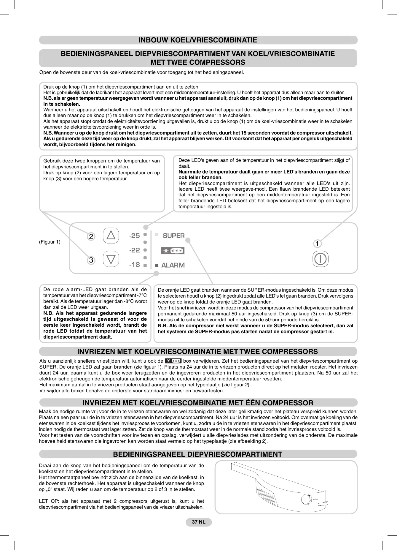 1 Le témoin orange s‘allume en cas d‘activation de la fonction SUPER. Pour activer cette fonction, appuyez plusieurs fois sur la touche (2) de sorte que tous les LED aient une forte intensité lumineuse, puis appuyez à nouveau sur la touche jusqu‘à ce que le témoin orange s‘allume. Cette fonction alimente le compresseur du freezer en continu pendant une durée maximale de 50 heures. Elle est indiquée pour congeler rapidement les aliments. Pour désactiver la fonction SUPER avant que les 50 heures ne soient écoulées, il suffit d’appuyer sur la touche (3). ATTENTION: si le compresseur est en pause à l‘activation de la fonction SUPER, le système attendra que le compresseur redémarre avant d’activer ce mode.