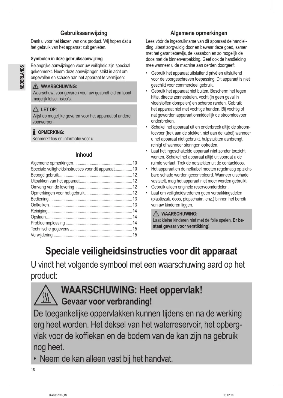 - Laat om veiligheidsredenen geen verpakkingsdelen (plasticzak, doos, piepschuim, enz.) binnen het bereik van uw kinderen liggen. WAARSCHUWING: Laat kleine kinderen niet met de folie spelen. Er bestaat gevaar voor verstikking! Speciale veiligheidsinstructies voor dit apparaat U vindt het volgende symbool met een waarschuwing aard op het product: WAARSCHUWING: Heet oppervlak! Gevaar voor verbranding! De toegankelijke oppervlakken kunnen tijdens en na de werking erg heet worden. Het deksel van het waterreservoir, het opbergvlak voor de koffiekan en de bodem van de kan zijn na gebruik nog heet.