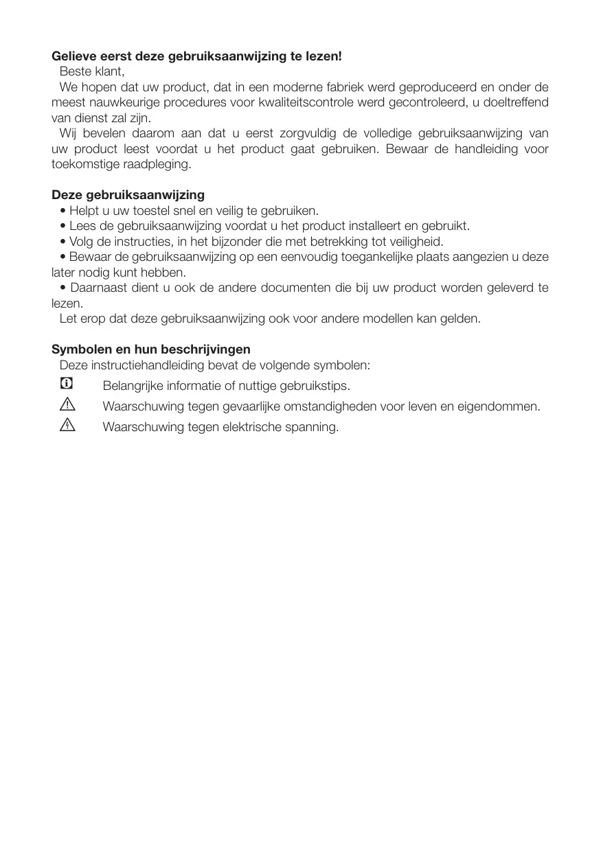 Gelieve eerst deze gebruiksaanwijzing te lezen! Beste klant, We hopen dat uw product, dat in een moderne fabriek werd geproduceerd en onder de meest nauwkeurige procedures voor kwaliteitscontrole werd gecontroleerd, u doeltreffend van dienst zal zijn. Wij bevelen daarom aan dat u eerst zorgvuldig de volledige gebruiksaanwijzing van uw product leest voordat u het product gaat gebruiken. Bewaar de handleiding voor toekomstige raadpleging. Deze gebruiksaanwijzing