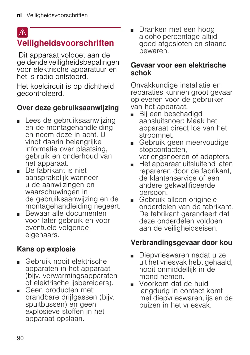 Veiligheidsvoorschriften . . . . . 90 Over deze gebruiksaanwijzing . . . . . .90 Kans op explosie . . . . . . . . . . . . . . . .90 Gevaar voor een elektrische schok. . . . . . . . . . . . . . . . . . . . . . . . .90 Verbrandingsgevaar door kou . . . . . .90 Risico op letsel . . . . . . . . . . . . . . . . .91 Gevaren door of van het koelmiddel . . . . . . . . . . . . . . . . . . . . .91 Vermijden van risico's voor kinderen en kwetsbare personen . . . 91 Materiële schade . . . . . . . . . . . . . . . .92 Gewicht . . . . . . . . . . . . . . . . . . . . . . .92