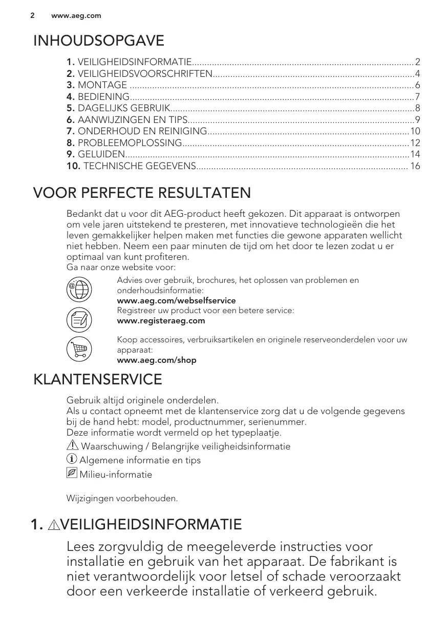 Advies over gebruik, brochures, het oplossen van problemen en onderhoudsinformatie: www.aeg.com/webselfservice Registreer uw product voor een betere service: www.registeraeg.com Koop accessoires, verbruiksartikelen en originele reserveonderdelen voor uw apparaat: www.aeg.com/shop