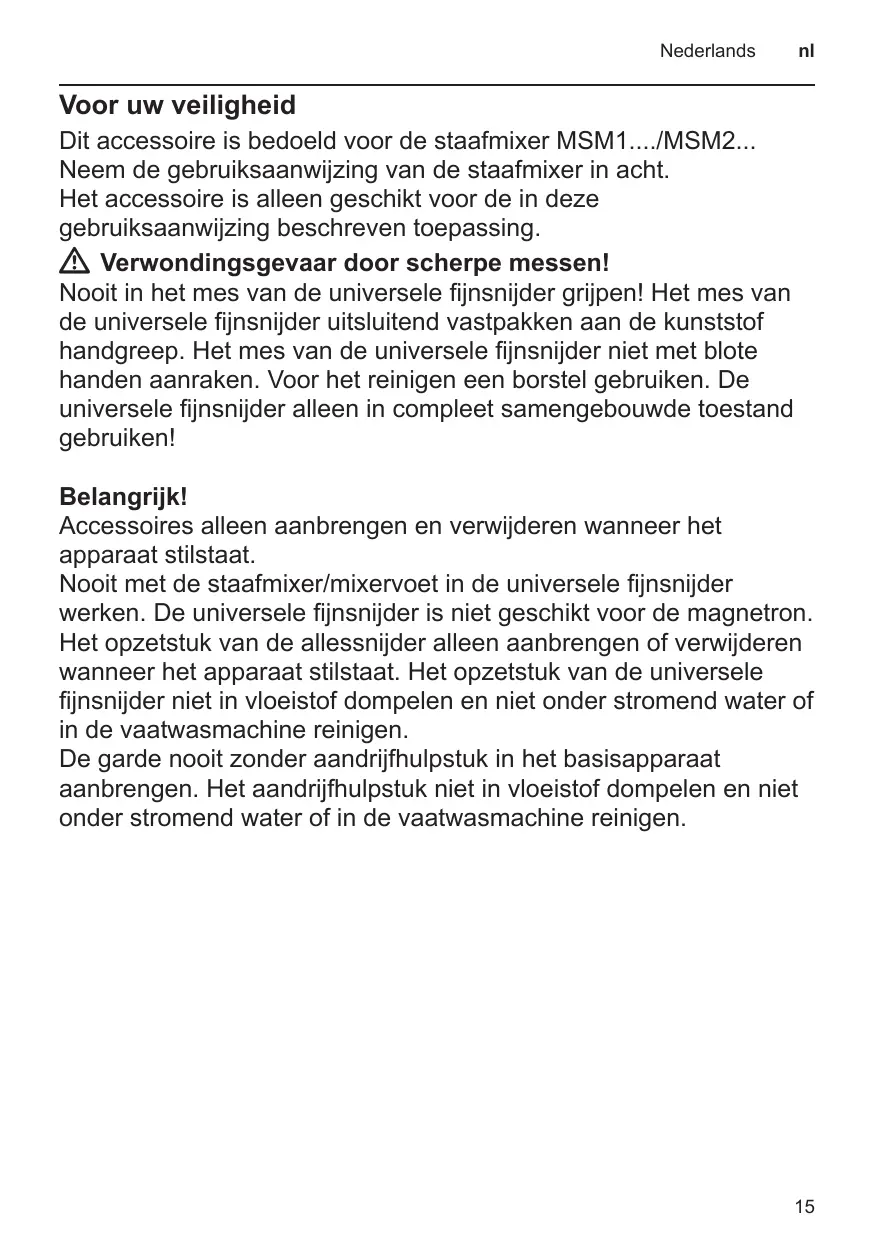 Voor uw veiligheid Dit accessoire is bedoeld voor de staafmixer MSM1..../MSM2... Neem de gebruiksaanwijzing van de staafmixer in acht. Het accessoire is alleen geschikt voor de in deze gebruiksaanwijzing beschreven toepassing. WW Verwondingsgevaar door scherpe messen! Nooit in het mes van de universele fijnsnijder grijpen! Het mes van de universele fijnsnijder uitsluitend vastpakken aan de kunststof handgreep. Het mes van de universele fijnsnijder niet met blote handen aanraken. Voor het reinigen een borstel gebruiken. De universele fijnsnijder alleen in compleet samengebouwde toestand gebruiken! Belangrijk! Accessoires alleen aanbrengen en verwijderen wanneer het apparaat stilstaat. Nooit met de staafmixer/mixervoet in de universele fijnsnijder werken. De universele fijnsnijder is niet geschikt voor de magnetron. Het opzetstuk van de allessnijder alleen aanbrengen of verwijderen wanneer het apparaat stilstaat. Het opzetstuk van de universele fijnsnijder niet in vloeistof dompelen en niet onder stromend water of in de vaatwasmachine reinigen. De garde nooit zonder aandrijfhulpstuk in het basisapparaat aanbrengen. Het aandrijfhulpstuk niet in vloeistof dompelen en niet onder stromend water of in de vaatwasmachine reinigen.
