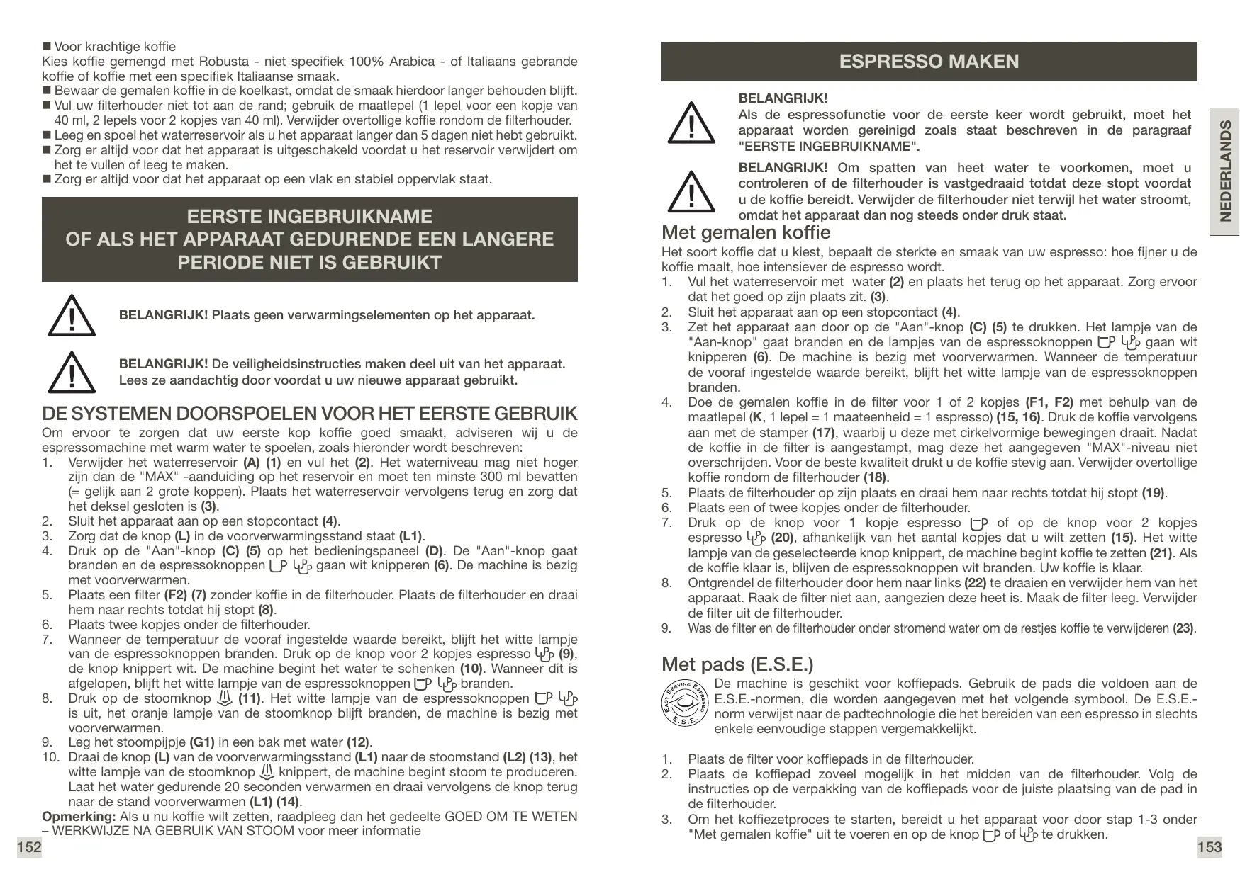 Om ervoor te zorgen dat uw eerste kop koffie goed smaakt, adviseren wij u de espressomachine met warm water te spoelen, zoals hieronder wordt beschreven: 1. Verwijder het waterreservoir (A) (1) en vul het (2). Het waterniveau mag niet hoger zijn dan de "MAX" -aanduiding op het reservoir en moet ten minste 300 ml bevatten (= gelijk aan 2 grote koppen). Plaats het waterreservoir vervolgens terug en zorg dat het deksel gesloten is (3). 2. Sluit het apparaat aan op een stopcontact (4). 3. Zorg dat de knop (L) in de voorverwarmingsstand staat (L1). 4. Druk op de "Aan"-knop (C) (5) op het bedieningspaneel (D). De "Aan"-knop gaat branden en de espressoknoppen gaan wit knipperen (6). De machine is bezig met voorverwarmen. 5. Plaats een filter (F2) (7) zonder koffie in de filterhouder. Plaats de filterhouder en draai hem naar rechts totdat hij stopt (8). 6. Plaats twee kopjes onder de filterhouder. 7. Wanneer de temperatuur de vooraf ingestelde waarde bereikt, blijft het witte lampje van de espressoknoppen branden. Druk op de knop voor 2 kopjes espresso (9), de knop knippert wit. De machine begint het water te schenken (10). Wanneer dit is afgelopen, blijft het witte lampje van de espressoknoppen branden. 8. Druk op de stoomknop (11). Het witte lampje van de espressoknoppen is uit, het oranje lampje van de stoomknop blijft branden, de machine is bezig met voorverwarmen. 9. Leg het stoompijpje (G1) in een bak met water (12). 10. Draai de knop (L) van de voorverwarmingsstand (L1) naar de stoomstand (L2) (13), het witte lampje van de stoomknop knippert, de machine begint stoom te produceren. Laat het water gedurende 20 seconden verwarmen en draai vervolgens de knop terug naar de stand voorverwarmen (L1) (14). Opmerking: Als u nu koffie wilt zetten, raadpleeg dan het gedeelte GOED OM TE WETEN – WERKWIJZE NA GEBRUIK VAN STOOM voor meer informatie