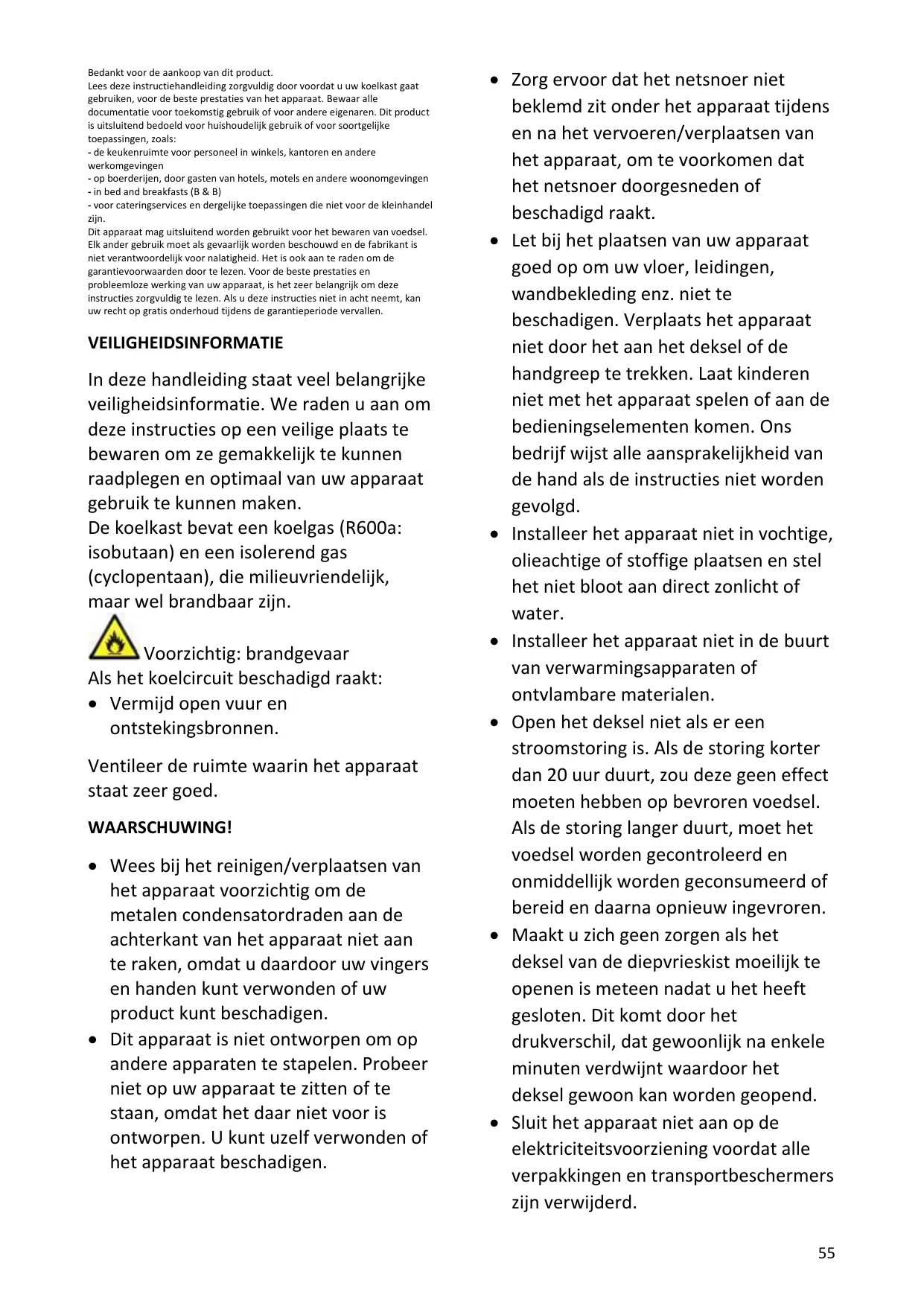 - dans les exploitations agricoles, pour la clientèle des hôtels, motels et autres environnements de type résidentiel - dans les hébergements Bed and Breakfast (B & B) - pour les services de restauration et des applications similaires non destinées à une vente au détail. Cet appareil doit être utilisé uniquement à des fins de conservation d'aliments, toute autre utilisation est considérée comme dangereuse et le fabricant ne sera pas responsable de toute omission. De plus, il est recommandé de prendre note des conditions de garantie. Pour obtenir la meilleure performance possible et un fonctionnement sans problème de votre appareil, il est très important de lire attentivement ces instructions. Tout non-respect de ces instructions peut annuler votre droit à des services gratuits pendant la période de garantie.