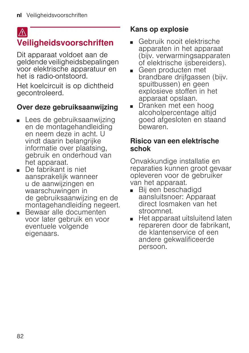 Gebruik nooit elektrische apparaten in het apparaat (bijv. verwarmingsapparaten of elektrische ijsbereiders). Geen producten met brandbare drijfgassen (bijv. spuitbussen) en geen explosieve stoffen in het apparaat opslaan. Dranken met een hoog alcoholpercentage altijd goed afgesloten en staand bewaren. Risico van een elektrische schok Onvakkundige installatie en reparaties kunnen groot gevaar opleveren voor de gebruiker van het apparaat. Bij een beschadigd aansluitsnoer: Apparaat direct losmaken van het stroomnet. Het apparaat uitsluitend laten repareren door de fabrikant, de klantenservice of een andere gekwalificeerde persoon. Veiligheidsvoorschriften nl