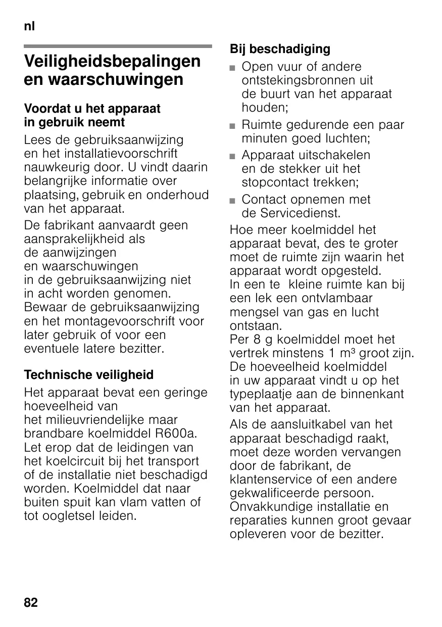 nlInhoudnlGebruiksa nwijzng Veiligheidsbepalingen en waarschuwingen Voordat u het apparaat in gebruik neemt Lees de gebruiksaanwijzing en het installatievoorschrift nauwkeurig door. U vindt daarin belangrijke informatie over plaatsing, gebruik en onderhoud van het apparaat. De fabrikant aanvaardt geen aansprakelijkheid als de aanwijzingen en waarschuwingen in de gebruiksaanwijzing niet in acht worden genomen. Bewaar de gebruiksaanwijzing en het montagevoorschrift voor later gebruik of voor een eventuele latere bezitter. Technische veiligheid Het apparaat bevat een geringe hoeveelheid van het milieuvriendelijke maar brandbare koelmiddel R600a. Let erop dat de leidingen van het koelcircuit bij het transport of de installatie niet beschadigd worden. Koelmiddel dat naar buiten spuit kan vlam vatten of tot oogletsel leiden.