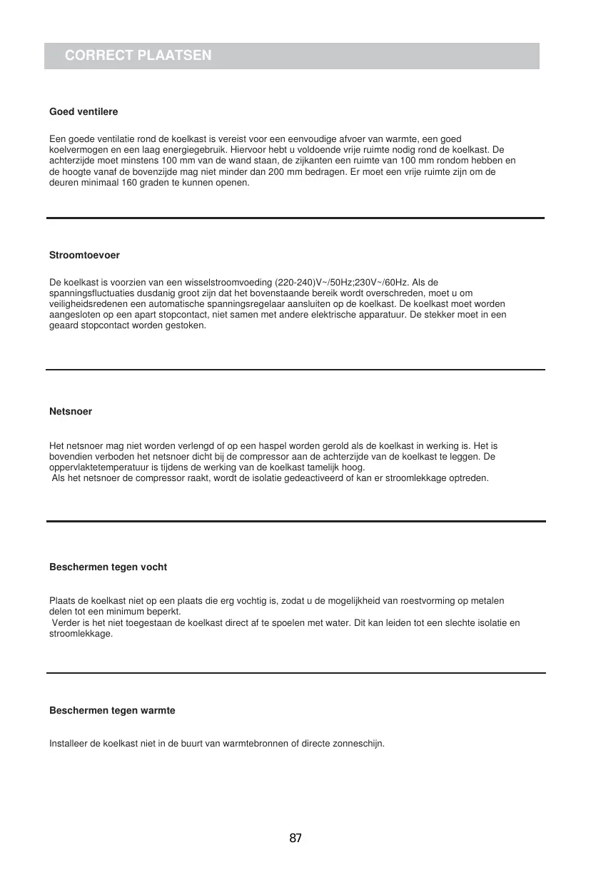 L'appareil est seulement compatible avec une prise de 220-240V~/ 50Hz ; 230V~/ 60Hz. Si vous souhaitez brancher votre réfrigérateur dans un lieu où le voltage ou la fréquence sont différents de ceux précédemment préconisés, il est important, par mesure de sécurité, que vous vous rapprochiez d’un électricien ou d’un professionnel qualifié de manière à faire les adaptations nécessaires, notamment en matière de mise à la terre.