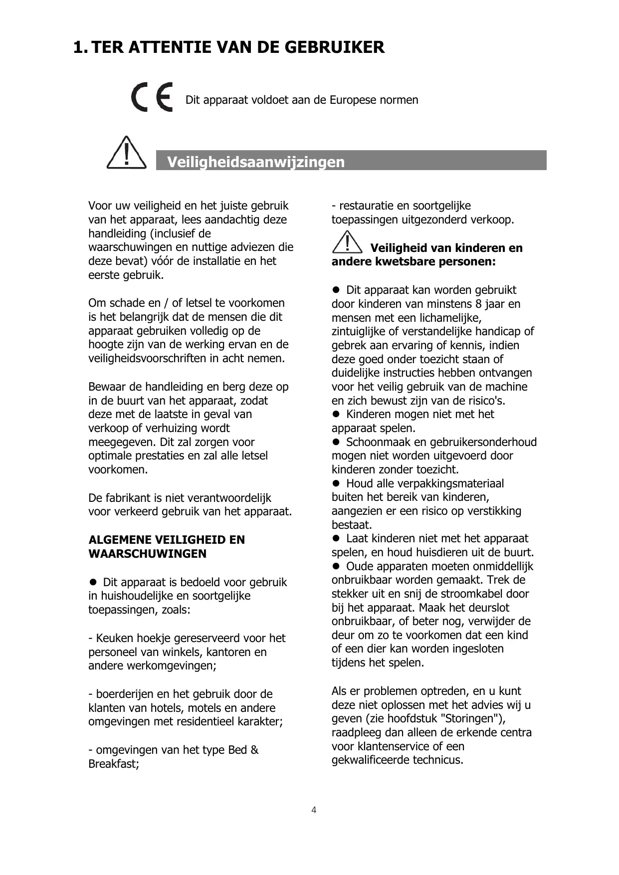 Cet appareil peut être utilisé par des enfants âgés d'au moins 8 ans et par des personnes ayant des capacités physiques, sensorielles ou mentales réduites ou dénuées d’expérience ou de connaissance, s'ils (si elles) sont correctement surveillé(e)s ou si des instructions relatives à l'utilisation de l'appareil en toute sécurité leur ont été données et si les risques encourus ont été appréhendés. Les enfants ne doivent pas jouer avec l’appareil. Le nettoyage et l'entretien par l'usager ne doivent pas être effectués par des enfants sans surveillance. Conservez tous les emballages hors de portée des enfants, car il existe un risque de suffocation. Ne laissez pas les enfants jouer avec l'appareil, éloignez les animaux domestiques. Les appareils usagés doivent immédiatement être rendus inutilisables. Débranchez et coupez le câble d'alimentation au ras de l'appareil. Rendez la fermeture de la porte inutilisable, ou mieux encore, démontez la porte afin d'éviter par exemple qu'un enfant ou un