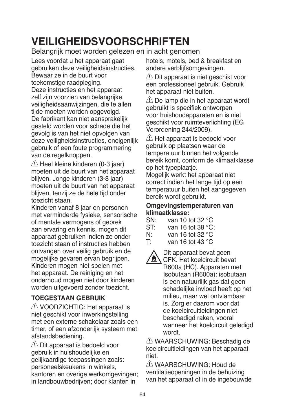 Cet appareil n’est pas conçu pour une utilisation professionnelle. N’utilisez pas l’appareil en extérieur. L’ampoule utilisée dans l’appareil est spécialement conçue pour des appareils ménagers et ne convient pas à l’éclairage général d’une pièce au domicile (Règlement CE 244/2009). L’appareil est conçu pour fonctionner dans des endroits où la température ambiante se trouve dans les plages suivantes, en fonction de la classe climatique indiquée sur la plaque signalétique. L’appareil peut ne pas fonctionner correctement s’il est exposé pendant une période prolongée à des températures non comprises dans la plage spécifiée. Températures ambiantes classe climatique : SN: De 10 à 32 °C ST: De 16 à 38 °C; N: De 16 à 32 °C T: De 16 à 43 °C Cet appareil ne contient pas de CFC. Le circuit de réfrigérant contient du R600a (HC). Appareils avec isobutane (R600a) : l’isobutane est un gaz naturel qui n’est pas nuisible à l’environnement, mais il est inflammable. Par conséquent, assurez-vous que les tuyaux du circuit réfrigérant ne sont pas endommagés, surtout lorsque vous videz le circuit réfrigérant.