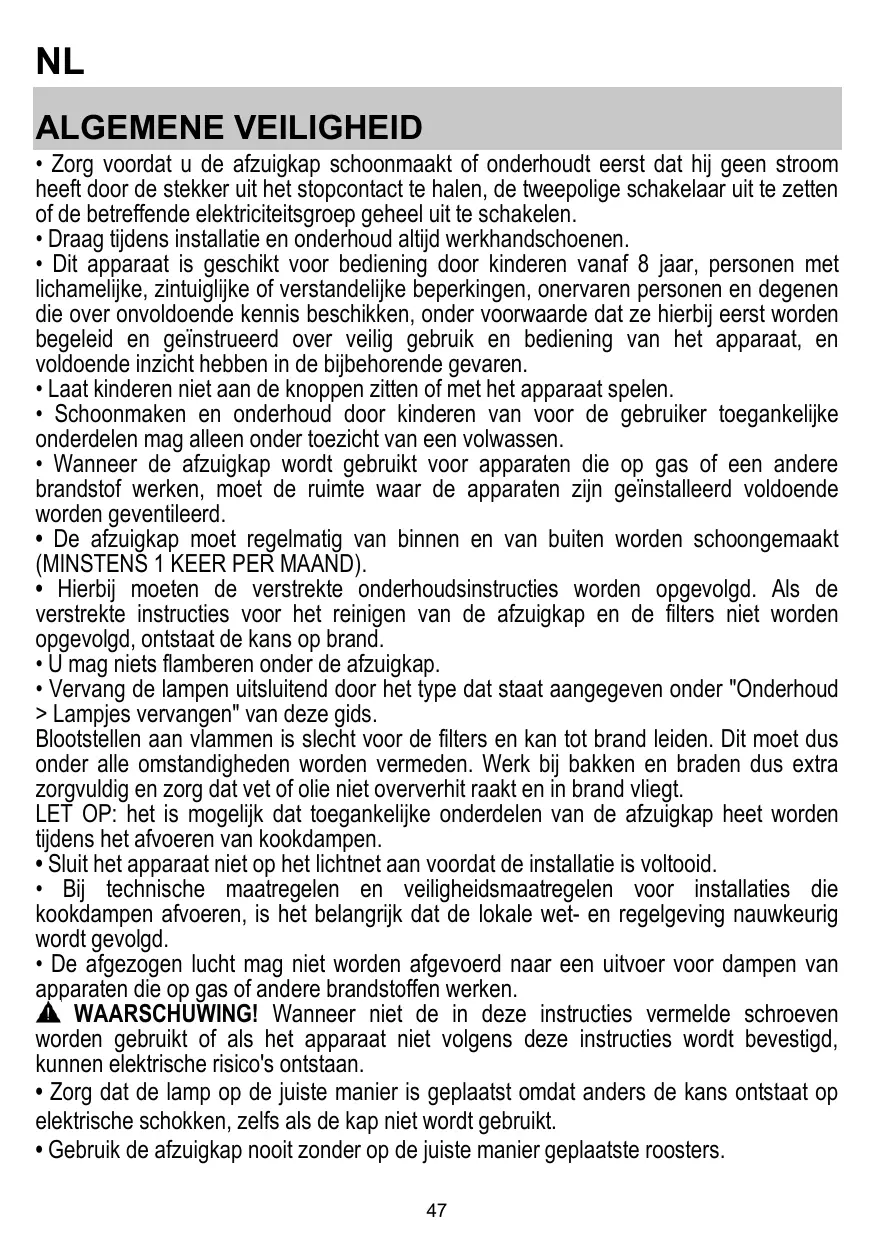 NL ALGEMENE VEILIGHEID • Zorg voordat u de afzuigkap schoonmaakt of onderhoudt eerst dat hij geen stroom heeft door de stekker uit het stopcontact te halen, de tweepolige schakelaar uit te zetten of de betreffende elektriciteitsgroep geheel uit te schakelen. • Draag tijdens installatie en onderhoud altijd werkhandschoenen. • Dit apparaat is geschikt voor bediening door kinderen vanaf 8 jaar, personen met lichamelijke, zintuiglijke of verstandelijke beperkingen, onervaren personen en degenen die over onvoldoende kennis beschikken, onder voorwaarde dat ze hierbij eerst worden begeleid en geïnstrueerd over veilig gebruik en bediening van het apparaat, en voldoende inzicht hebben in de bijbehorende gevaren. • Laat kinderen niet aan de knoppen zitten of met het apparaat spelen. • Schoonmaken en onderhoud door kinderen van voor de gebruiker toegankelijke onderdelen mag alleen onder toezicht van een volwassen. • Wanneer de afzuigkap wordt gebruikt voor apparaten die op gas of een andere brandstof werken, moet de ruimte waar de apparaten zijn geïnstalleerd voldoende worden geventileerd. • De afzuigkap moet regelmatig van binnen en van buiten worden schoongemaakt (MINSTENS 1 KEER PER MAAND). • Hierbij moeten de verstrekte onderhoudsinstructies worden opgevolgd. Als de verstrekte instructies voor het reinigen van de afzuigkap en de filters niet worden opgevolgd, ontstaat de kans op brand. • U mag niets flamberen onder de afzuigkap. • Vervang de lampen uitsluitend door het type dat staat aangegeven onder "Onderhoud > Lampjes vervangen" van deze gids. Blootstellen aan vlammen is slecht voor de filters en kan tot brand leiden. Dit moet dus onder alle omstandigheden worden vermeden. Werk bij bakken en braden dus extra zorgvuldig en zorg dat vet of olie niet oververhit raakt en in brand vliegt. LET OP: het is mogelijk dat toegankelijke onderdelen van de afzuigkap heet worden tijdens het afvoeren van kookdampen. • Sluit het apparaat niet op het lichtnet aan voordat de installatie is voltooid. • Bij technische maatregelen en veiligheidsmaatregelen voor installaties die kookdampen afvoeren, is het belangrijk dat de lokale wet- en regelgeving nauwkeurig wordt gevolgd. • De afgezogen lucht mag niet worden afgevoerd naar een uitvoer voor dampen van apparaten die op gas of andere brandstoffen werken. WAARSCHUWING! Wanneer niet de in deze instructies vermelde schroeven worden gebruikt of als het apparaat niet volgens deze instructies wordt bevestigd, kunnen elektrische risico's ontstaan. • Zorg dat de lamp op de juiste manier is geplaatst omdat anders de kans ontstaat op elektrische schokken, zelfs als de kap niet wordt gebruikt. • Gebruik de afzuigkap nooit zonder op de juiste manier geplaatste roosters. 47
