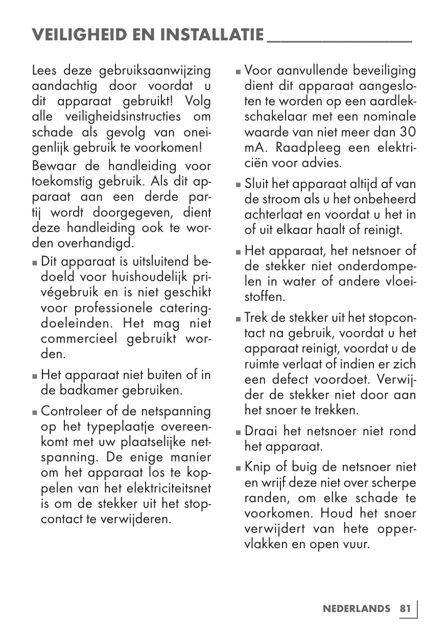 Conservez le manuel d'utilisation car vous pourriez en avoir besoin ultérieurement. Dans le cas où cet appareil change de propriétaire, remettez également le manuel d'utilisation au nouveau bénéficiaire. Le présent appareil est destiné à un usage domestique privé uniquement et ne saurait convenir à une utilisation professionnelle en restauration. Il ne doit pas être utilisé à des fins commerciales. Évitez d'utiliser l'appareil à l'extérieur ou dans la salle de bain. Assurez-vous que la tension de secteur figurant sur la plaque signalétique correspond à votre alimentation secteur locale. Le seul moyen de déconnecter l'appareil du secteur consiste à débrancher la prise.