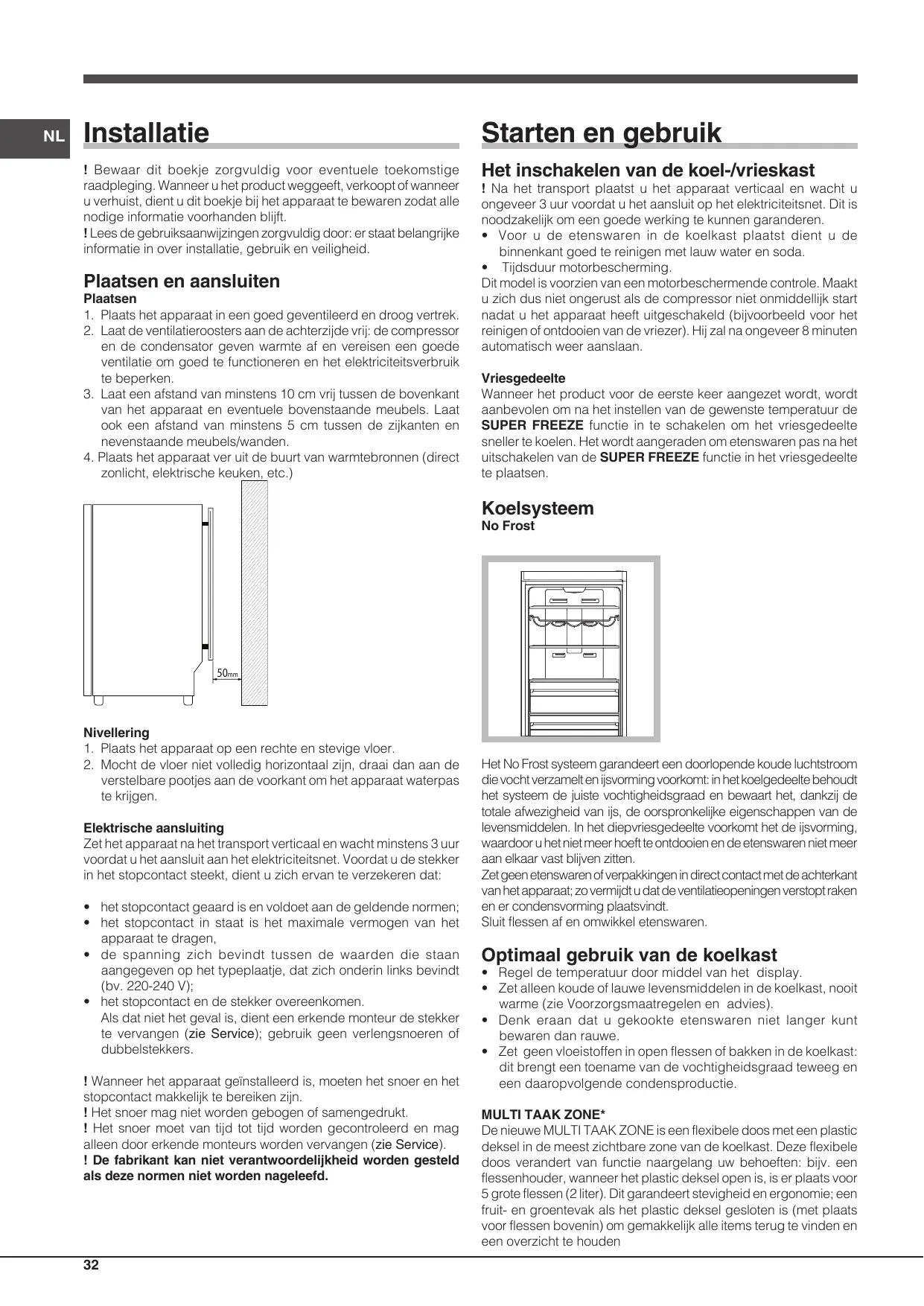 Le No Frost gère un flux continu d’air froid qui absorbe l’humidité et empêche la formation de glace et de givre: il maintient un niveau d’humidité adéquat à l’intérieur du compartiment réfrigérateur et, grâce à l’absence de givre, il préserve les qualités originaires des aliments; dans le compartiment congélateur il évite la formation de glace, il n’y a par conséquent plus besoin de dégivrer et les aliments ne collent plus entre eux.Ne placez pas d’aliments ou de récipients contre la paroi refroidissante arrière pour ne pas boucher les trous d’aération et éviter une formation rapide d’eau condensée. Fermez bien les bouteilles et emballez les aliments.