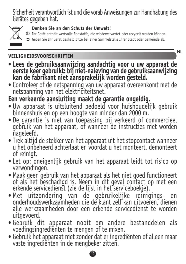 Toute erreur de branchement annule la garantie. • Votre appareil est destiné uniquement à un usage domestique à l’intérieur de la maison et à une altitude inférieure à 2000m. • La garantie ne s’appliquera pas en cas d’utilisation commerciale, inappropriée, ou non respect de la notice. • Toujours déconnecter l’appareil de l’alimentation si on le laisse sans surveillance et avant montage, démontage ou nettoyage. • Attention aux risques de blessure en cas de mauvaise utilisation de l’appareil. • N’utilisez pas votre appareil s’il ne fonctionne pas correctement ou s’il a été endommagé. Dans ce cas, adressez-vous à un centre service agréé (voir liste dans le livret service). • Toute intervention autre que le nettoyage et l’entretien usuel par le client doit être effectuée par un centre service agréé. • N’utilisez jamais cet appareil pour mélanger ou mixer d’autres éléments que des ingrédients alimentaires. • N’utilisez jamais le bol mixeur sans ingrédient ou avec des ingrédients solides uniquement. • Versez toujours les ingrédients liquides en premier dans le bol mixeur avant d’ajouter les ingrédients solides. • Ne pas utiliser le bol mixeur ou les accessoires (selon modèle) comme récipients (conservation, congélation, cuisson, stérilisation) • Afin d’éviter tout débordement, ne pas dépasser le niveau maximum du bol lorsque celui-ci est indiqué. • N e touchez jamais les pièces en mouvement (couteaux…). • Les lames du couteau du bol mixeur et des accessoires (selon modèle) sont très coupantes: manipulez-les avec précaution pour ne pas vous blesser lors du versage, du montage/démontage des 1