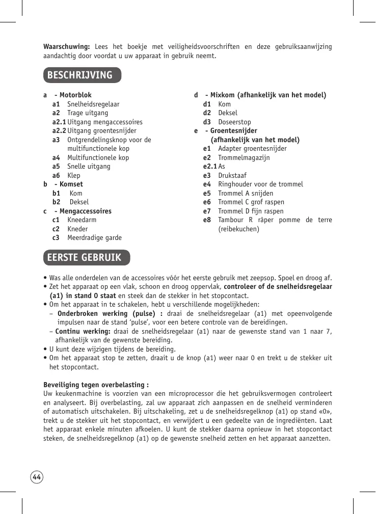 (a1) soit bien en position « 0 » puis branchez votre appareil. • Pour mettre en marche, vous avez plusieurs possibilités : ––Marche intermittente (pulse) : Tournez le bouton variateur (a1) sur la position « pulse » par impulsions successives pour un meilleur contrôle des préparations. ––Marche continue : Tournez le bouton variateur (a1) sur la position désirée de « 1 » à « 7 » selon les préparations effectuées. • Vous pouvez la modifier en cours de préparation. • Pour arrêter l’appareil, ramenez le bouton (a1) sur le « 0 », puis débranchez votre appareil. Protection surcharge : Votre appareil de cuisine est équipé d’un micro processeur qui contrôle et analyse la puissance en fonctionnement. En cas de charge trop importante, votre appareil s’adaptera en réduisant sa vitesse ou s’arrêtera tout seul. En cas d’arrêt, ramenez votre bouton variateur de vitesse (a1) sur la position «0», débranchez votre appareil et retirez une partie de vos ingrédients. Laissez votre appareil reposer quelques minutes. Vous pouvez alors le rebrancher et démarrer en tournant le bouton variateur (a1) sur la vitesse désirée selon la recette.