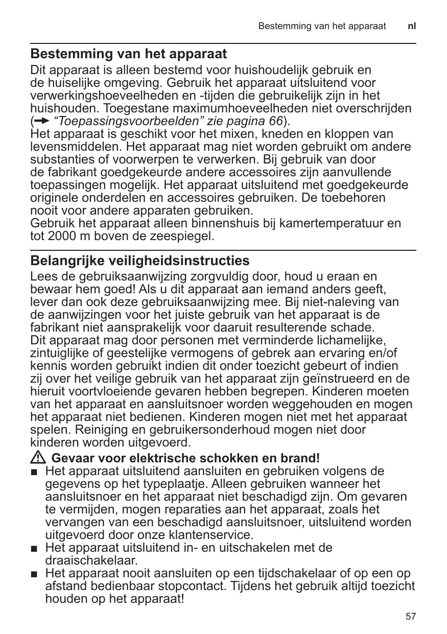 Dit apparaat is alleen bestemd voor huishoudelijk gebruik en de huiselijke omgeving. Gebruik het apparaat uitsluitend voor verwerkingshoeveelheden en -tijden die gebruikelijk zijn in het huishouden. Toegestane maximumhoeveelheden niet overschrijden (X “Toepassingsvoorbeelden” zie pagina 66). Het apparaat is geschikt voor het mixen, kneden en kloppen van levensmiddelen. Het apparaat mag niet worden gebruikt om andere substanties of voorwerpen te verwerken. Bij gebruik van door de fabrikant goedgekeurde andere accessoires zijn aanvullende toepassingen mogelijk. Het apparaat uitsluitend met goedgekeurde originele onderdelen en accessoires gebruiken. De toebehoren nooit voor andere apparaten gebruiken. Gebruik het apparaat alleen binnenshuis bij kamertemperatuur en tot 2000 m boven de zeespiegel.