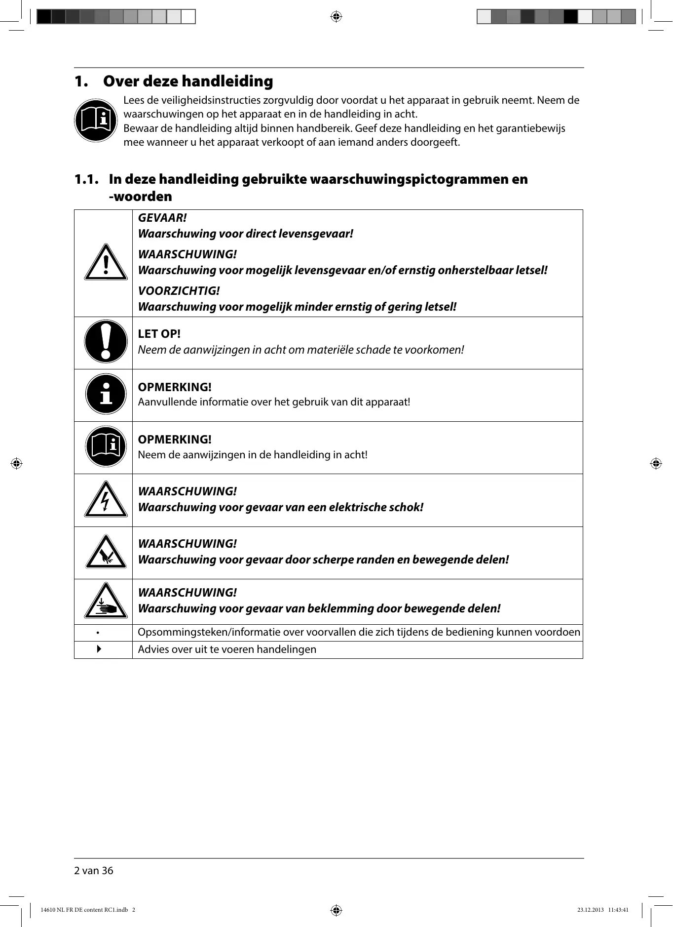WAARSCHUWING! Contenu de la livraison15 Consignes de sécurité16 4.1. Catégories de personnes non autorisées 16 4.2. Remarques générales 16 4.3. Installation et branchement électrique 16 4.4. Fonctionnement en toute sécurité 17 6.2. Essai de fonctionnement du bol mélangeur 19 6.3. Démonter le bol mélangeur 19 6.4. Monter le bol mixeur 20 6.5. Essai de fonctionnement du bol mixeur 20 6.6. Démonter le bol mixeur 20 Utiliser le bol mélangeur 21 7.1. Mélanger et pétrir une pâte 21 7.2. Battre des blancs en neige 22 7.3. Battre de la chantilly 22 Utiliser le bol mixeur 22 Nettoyage de l'appareil 23 Arrêt de l'appareil 23 Dépannage rapide 23 Recyclage24 Caractéristiques techniques 24 déclarations de conformité 24 Gardez toujours ce mode d'emploi à portée de main. Si vous vendez ou donnez l'appareil, pensez impérativement à remettre également ce mode d'emploi ainsi que le certificat de garantie au nouveau propriétaire.