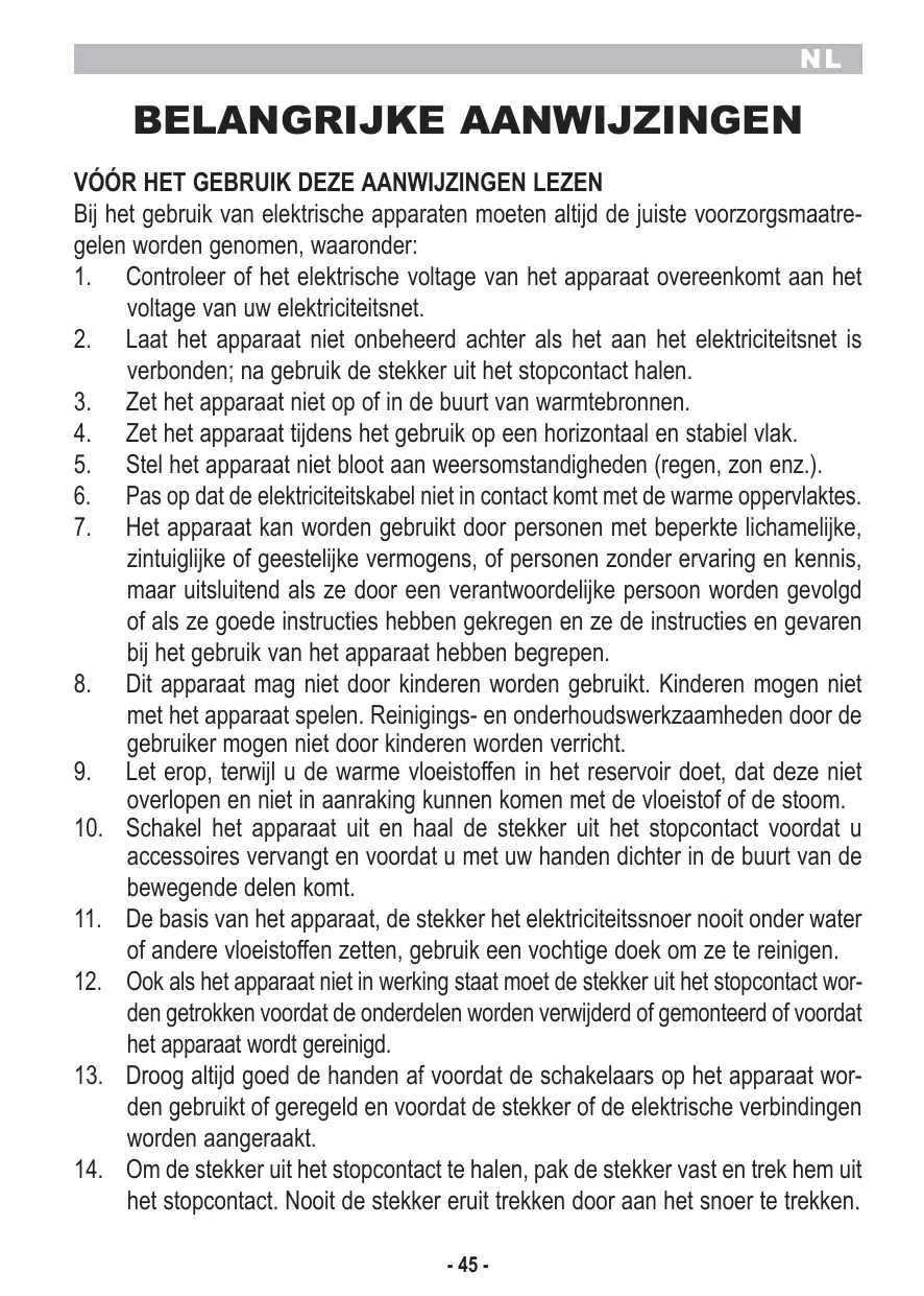 NL BELANGRIJKE AANWIJZINGEN VÓÓR HET GEBRUIK DEZE AANWIJZINGEN LEZEN Bij het gebruik van elektrische apparaten moeten altijd de juiste voorzorgsmaatregelen worden genomen, waaronder: 1. Controleer of het elektrische voltage van het apparaat overeenkomt aan het voltage van uw elektriciteitsnet. 2. Laat het apparaat niet onbeheerd achter als het aan het elektriciteitsnet is verbonden; na gebruik de stekker uit het stopcontact halen. 3. Zet het apparaat niet op of in de buurt van warmtebronnen. 4. Zet het apparaat tijdens het gebruik op een horizontaal en stabiel vlak. 5. Stel het apparaat niet bloot aan weersomstandigheden (regen, zon enz.). 6. Pas op dat de elektriciteitskabel niet in contact komt met de warme oppervlaktes. 7. Het apparaat kan worden gebruikt door personen met beperkte lichamelijke, zintuiglijke of geestelijke vermogens, of personen zonder ervaring en kennis, maar uitsluitend als ze door een verantwoordelijke persoon worden gevolgd of als ze goede instructies hebben gekregen en ze de instructies en gevaren bij het gebruik van het apparaat hebben begrepen. 8. Dit apparaat mag niet door kinderen worden gebruikt. Kinderen mogen niet met het apparaat spelen. Reinigings- en onderhoudswerkzaamheden door de gebruiker mogen niet door kinderen worden verricht. 9. Let erop, terwijl u de warme vloeistoffen in het reservoir doet, dat deze niet overlopen en niet in aanraking kunnen komen met de vloeistof of de stoom. 10. Schakel het apparaat uit en haal de stekker uit het stopcontact voordat u accessoires vervangt en voordat u met uw handen dichter in de buurt van de bewegende delen komt. 11. De basis van het apparaat, de stekker het elektriciteitssnoer nooit onder water of andere vloeistoffen zetten, gebruik een vochtige doek om ze te reinigen. 12. Ook als het apparaat niet in werking staat moet de stekker uit het stopcontact worden getrokken voordat de onderdelen worden verwijderd of gemonteerd of voordat het apparaat wordt gereinigd. 13. Droog altijd goed de handen af voordat de schakelaars op het apparaat worden gebruikt of geregeld en voordat de stekker of de elektrische verbindingen worden aangeraakt. 14. Om de stekker uit het stopcontact te halen, pak de stekker vast en trek hem uit het stopcontact. Nooit de stekker eruit trekken door aan het snoer te trekken. - 45 -