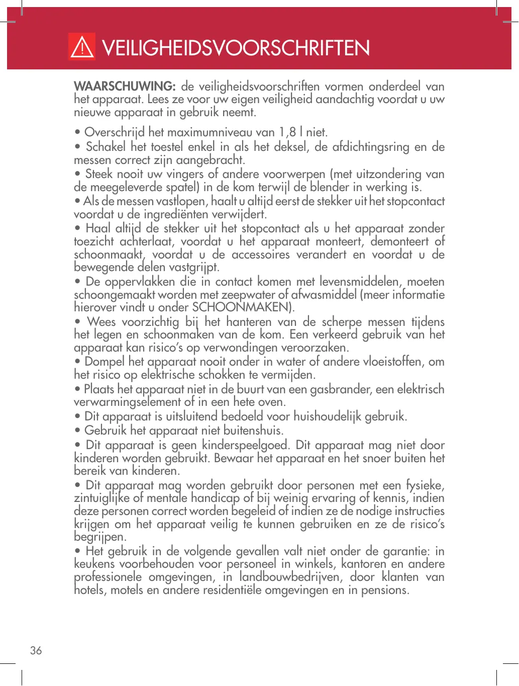 VEILIGHEIDSVOORSCHRIFTEN WAARSCHUWING: de veiligheidsvoorschriften vormen onderdeel van het apparaat. Lees ze voor uw eigen veiligheid aandachtig voordat u uw nieuwe apparaat in gebruik neemt. • Overschrijd het maximumniveau van 1,8 l niet. • Schakel het toestel enkel in als het deksel, de afdichtingsring en de messen correct zijn aangebracht. • Steek nooit uw vingers of andere voorwerpen (met uitzondering van de meegeleverde spatel) in de kom terwijl de blender in werking is. • Als de messen vastlopen, haalt u altijd eerst de stekker uit het stopcontact voordat u de ingrediënten verwijdert. • Haal altijd de stekker uit het stopcontact als u het apparaat zonder toezicht achterlaat, voordat u het apparaat monteert, demonteert of schoonmaakt, voordat u de accessoires verandert en voordat u de bewegende delen vastgrijpt. • De oppervlakken die in contact komen met levensmiddelen, moeten schoongemaakt worden met zeepwater of afwasmiddel (meer informatie hierover vindt u onder SCHOONMAKEN). • Wees voorzichtig bij het hanteren van de scherpe messen tijdens het legen en schoonmaken van de kom. Een verkeerd gebruik van het apparaat kan risico’s op verwondingen veroorzaken. • Dompel het apparaat nooit onder in water of andere vloeistoffen, om het risico op elektrische schokken te vermijden. • Plaats het apparaat niet in de buurt van een gasbrander, een elektrisch verwarmingselement of in een hete oven. • Dit apparaat is uitsluitend bedoeld voor huishoudelijk gebruik. • Gebruik het apparaat niet buitenshuis. • Dit apparaat is geen kinderspeelgoed. Dit apparaat mag niet door kinderen worden gebruikt. Bewaar het apparaat en het snoer buiten het bereik van kinderen. • Dit apparaat mag worden gebruikt door personen met een fysieke, zintuiglijke of mentale handicap of bij weinig ervaring of kennis, indien deze personen correct worden begeleid of indien ze de nodige instructies krijgen om het apparaat veilig te kunnen gebruiken en ze de risico’s begrijpen. • Het gebruik in de volgende gevallen valt niet onder de garantie: in keukens voorbehouden voor personeel in winkels, kantoren en andere professionele omgevingen, in landbouwbedrijven, door klanten van hotels, motels en andere residentiële omgevingen en in pensions.