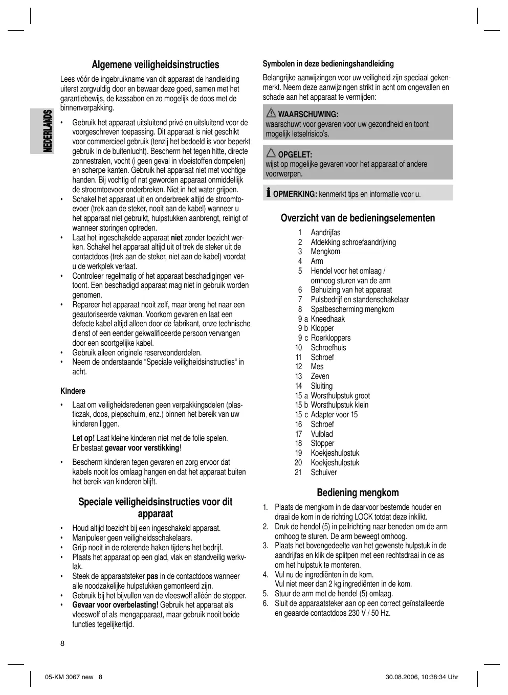 Houd altijd toezicht bij een ingeschakeld apparaat. Manipuleer geen veiligheidsschakelaars. Grijp nooit in de roterende haken tijdens het bedrijf. Plaats het apparaat op een glad, vlak en standveilig werkvlak. Steek de apparaatsteker pas in de contactdoos wanneer alle noodzakelijke hulpstukken gemonteerd zijn. Gebruik bij het bijvullen van de vleeswolf alléén de stopper. Gevaar voor overbelasting! Gebruik het apparaat als vleeswolf of als mengapparaat, maar gebruik nooit beide functies tegelijkertijd.
