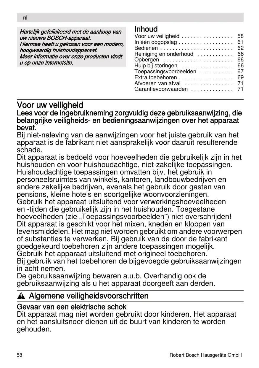 Hartelijk gefeliciteerd met de aankoop van uw nieuwe BOSCH-apparaat. Hiermee heeft u gekozen voor een modern, hoogwaardig huishoudapparaat. Meer informatie over onze producten vindt u op onze internetsite. Inhoud Voor uw veiligheid . . . . . . . . . . . . . . . . . In één oogopslag . . . . . . . . . . . . . . . . . . Bedienen . . . . . . . . . . . . . . . . . . . . . . . . Reiniging en onderhoud . . . . . . . . . . . . Opbergen . . . . . . . . . . . . . . . . . . . . . . . Hulp bij storingen . . . . . . . . . . . . . . . . . Toepassingsvoorbeelden . . . . . . . . . . . Extra toebehoren . . . . . . . . . . . . . . . . . . Afvoeren van afval . . . . . . . . . . . . . . . . Garantievoorwaarden . . . . . . . . . . . . . .