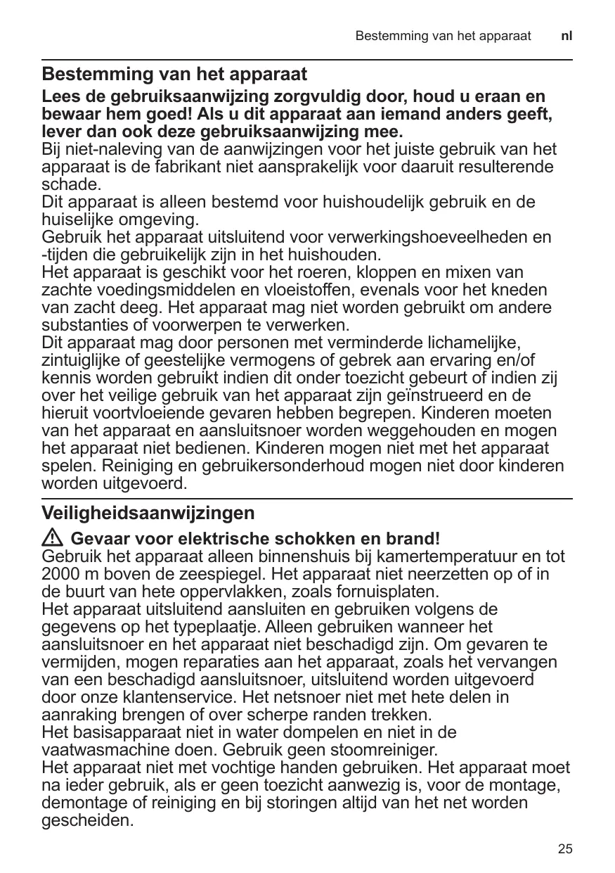 Lees de gebruiksaanwijzing zorgvuldig door, houd u eraan en bewaar hem goed! Als u dit apparaat aan iemand anders geeft, lever dan ook deze gebruiksaanwijzing mee. Bij niet-naleving van de aanwijzingen voor het juiste gebruik van het apparaat is de fabrikant niet aansprakelijk voor daaruit resulterende schade. Dit apparaat is alleen bestemd voor huishoudelijk gebruik en de huiselijke omgeving. Gebruik het apparaat uitsluitend voor verwerkingshoeveelheden en -tijden die gebruikelijk zijn in het huishouden. Het apparaat is geschikt voor het roeren, kloppen en mixen van zachte voedingsmiddelen en vloeistoffen, evenals voor het kneden van zacht deeg. Het apparaat mag niet worden gebruikt om andere substanties of voorwerpen te verwerken. Dit apparaat mag door personen met verminderde lichamelijke, zintuiglijke of geestelijke vermogens of gebrek aan ervaring en/of kennis worden gebruikt indien dit onder toezicht gebeurt of indien zij over het veilige gebruik van het apparaat zijn geïnstrueerd en de hieruit voortvloeiende gevaren hebben begrepen. Kinderen moeten van het apparaat en aansluitsnoer worden weggehouden en mogen het apparaat niet bedienen. Kinderen mogen niet met het apparaat spelen. Reiniging en gebruikersonderhoud mogen niet door kinderen worden uitgevoerd.