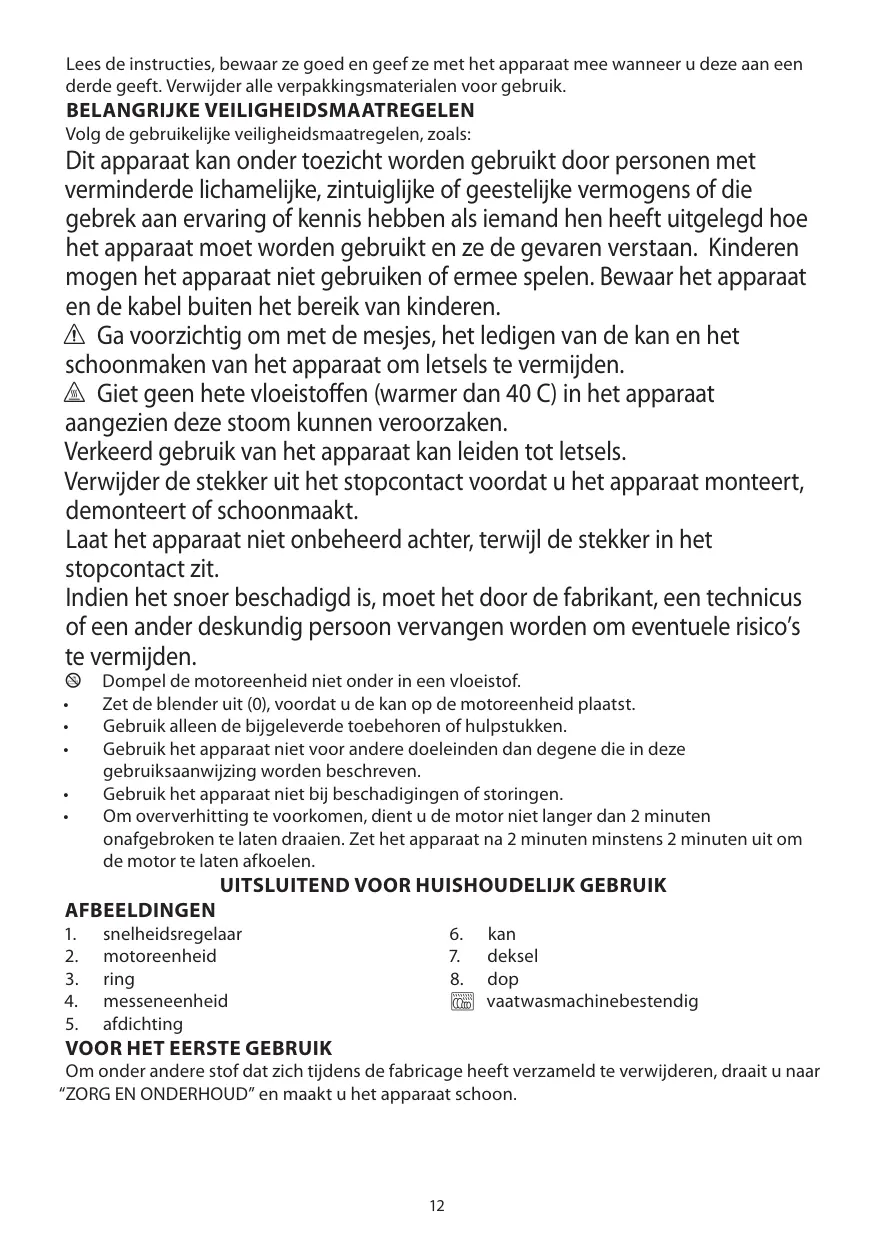 Dit apparaat kan onder toezicht worden gebruikt door personen met verminderde lichamelijke, zintuiglijke of geestelijke vermogens of die gebrek aan ervaring of kennis hebben als iemand hen heeft uitgelegd hoe het apparaat moet worden gebruikt en ze de gevaren verstaan. Kinderen mogen het apparaat niet gebruiken of ermee spelen. Bewaar het apparaat en de kabel buiten het bereik van kinderen. c Ga voorzichtig om met de mesjes, het ledigen van de kan en het schoonmaken van het apparaat om letsels te vermijden. h Giet geen hete vloeistoffen (warmer dan 40 C) in het apparaat aangezien deze stoom kunnen veroorzaken. Verkeerd gebruik van het apparaat kan leiden tot letsels. Verwijder de stekker uit het stopcontact voordat u het apparaat monteert, demonteert of schoonmaakt. Laat het apparaat niet onbeheerd achter, terwijl de stekker in het stopcontact zit. Indien het snoer beschadigd is, moet het door de fabrikant, een technicus of een ander deskundig persoon vervangen worden om eventuele risico’s te vermijden. l • • • • •
