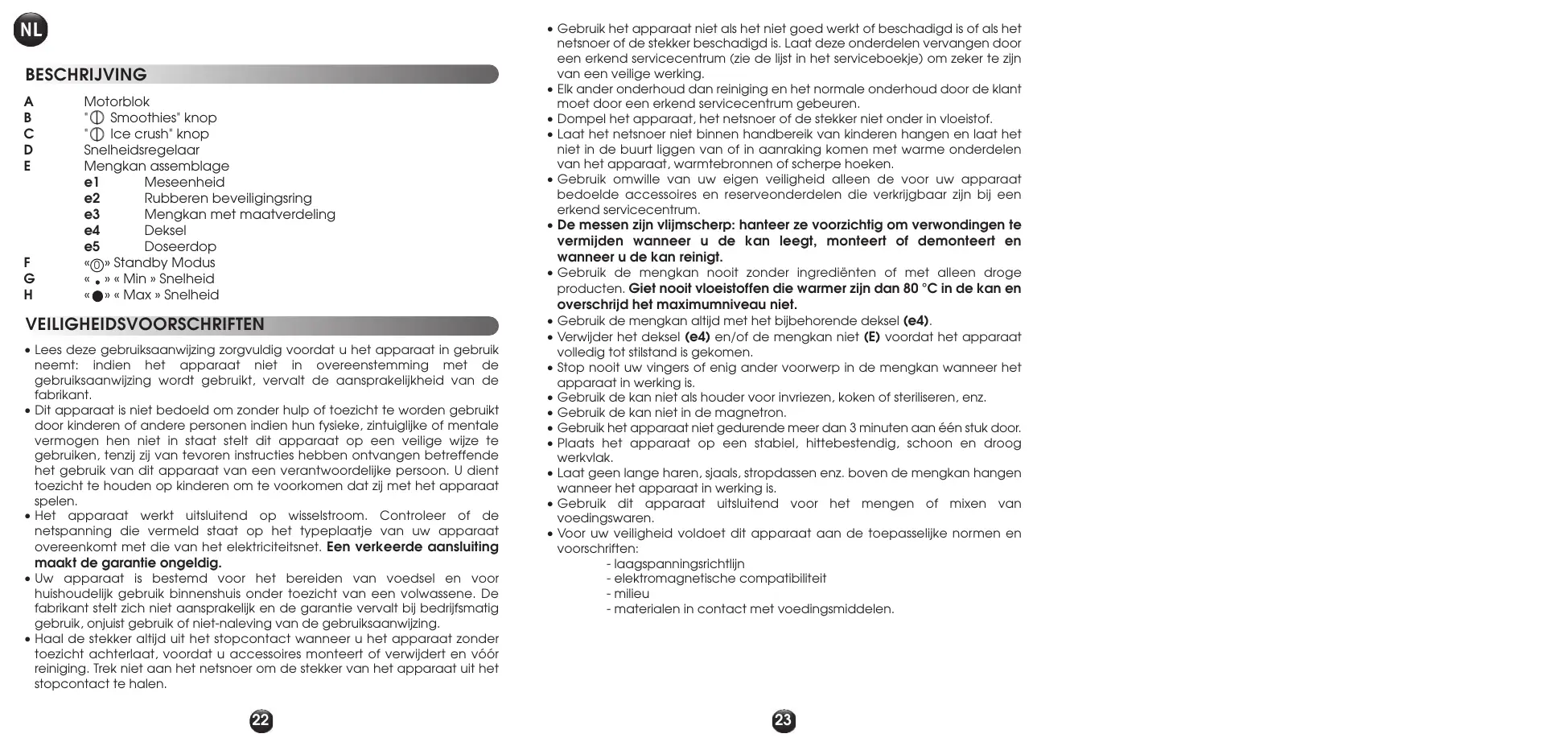 • N’enlevez jamais le couvercle (e4) et/ou le bol mixeur (E) avant l’arrêt complet de l’appareil. • Ne placez jamais vos doigts ou tout autre objet dans le bol mixeur pendant le fonctionnement de l’appareil. • Ne pas utiliser le bol comme récipient (congélation, cuisson, stérilisation, …). • Ne passez pas le bol au micro-ondes. • N’utilisez pas votre appareil plus de 3 minutes en marche continue. • Placez votre appareil sur un plan de travail stable, résistant à la chaleur, propre et sec. • Ne laissez pas pendre vos cheveux, un foulard, une cravate etc. au dessus du bol pendant le fonctionnement de l’appareil. • N’utilisez jamais cet appareil pour mélanger ou mixer d’autres éléments que des ingrédients alimentaires. • Pour votre sécurité, cet appareil est conforme aux normes et réglementations applicables : - Directive Basse Tension - Compatibilité Electromagnétique • Placez l’ensemble (e1+e2) sur le fond du bol (e3). Verrouillez-le en tournant le bloc lames d’un quart de tour dans le sens inverse des aiguilles d’une montre (Fig.2). • Introduisez les ingrédients dans le bol assemblé. • Insérez le couvercle (e4) sur le bol. Placez le bouchon doseur (e5) dans son logement situé sur le couvercle. • Placez l’ensemble bol mixeur (E) sur le bloc moteur (A). Deux positions du bol mixeur sont possibles : poignée du bol à droite ou à gauche du bloc moteur (Fig.3).