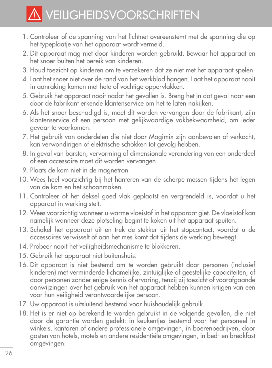 VEILIGHEIDSVOORSCHRIFTEN 01. Controleer of de spanning van het lichtnet overeenstemt met de spanning die op het typeplaatje van het apparaat wordt vermeld. 02. Dit apparaat mag niet door kinderen worden gebruikt. Bewaar het apparaat en het snoer buiten het bereik van kinderen. 03. Houd toezicht op kinderen om te verzekeren dat ze niet met het apparaat spelen. 04. Laat het snoer niet over de rand van het werkblad hangen. Laat het apparaat nooit in aanraking komen met hete of vochtige oppervlakken. 05. Gebruik het apparaat nooit nadat het gevallen is. Breng het in dat geval naar een door de fabrikant erkende klantenservice om het te laten nakijken. 06. Als het snoer beschadigd is, moet dit worden vervangen door de fabrikant, zijn klantenservice of een persoon met gelijkwaardige vakbekwaamheid, om ieder gevaar te voorkomen. 07. Het gebruik van onderdelen die niet door Magimix zijn aanbevolen of verkocht, kan verwondingen of elektrische schokken tot gevolg hebben. 08. In geval van barsten, vervorming of dimensionale verandering van een onderdeel of een accessoire moet dit worden vervangen. 09. Plaats de kom niet in de magnetron 10. Wees heel voorzichtig bij het hanteren van de scherpe messen tijdens het legen van de kom en het schoonmaken. 11. Controleer of het deksel goed vlak geplaatst en vergrendeld is, voordat u het apparaat in werking stelt. 12. Wees voorzichtig wanneer u warme vloeistof in het apparaat giet. De vloeistof kan namelijk wanneer deze plotseling begint te koken uit het apparaat spuiten. 13. Schakel het apparaat uit en trek de stekker uit het stopcontact, voordat u de accessoires verwisselt of aan het mes komt dat tijdens de werking beweegt. 14. Probeer nooit het veiligheidsmechanisme te blokkeren. 15. Gebruik het apparaat niet buitenshuis. 16. Dit apparaat is niet bestemd om te worden gebruikt door personen (inclusief kinderen) met verminderde lichamelijke, zintuiglijke of geestelijke capaciteiten, of door personen zonder enige kennis of ervaring, tenzij zij toezicht of voorafgaande aanwijzingen over het gebruik van het apparaat hebben kunnen krijgen van een voor hun veiligheid verantwoordelijke persoon. 17. Uw apparaat is uitsluitend bestemd voor huishoudelijk gebruik. 18. Het is er niet op berekend te worden gebruikt in de volgende gevallen, die niet door de garantie worden gedekt: in keukentjes bestemd voor het personeel in winkels, kantoren of andere professionele omgevingen, in boerenbedrijven, door gasten van hotels, motels en andere residentiële omgevingen, in bed- en breakfast omgevingen. 26