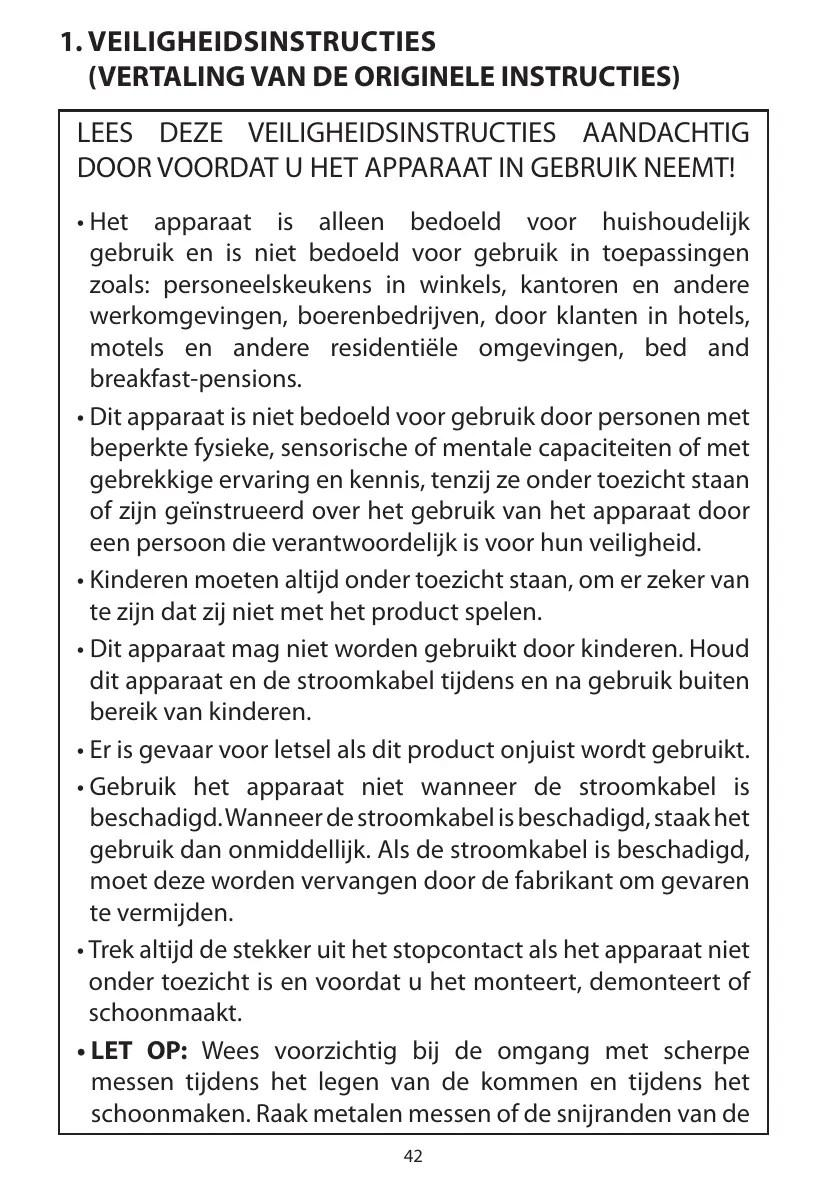 • L’appareil est destiné à un usage domestique seulement et n’est pas destiné à être utilisé dans des applications telles que : les cuisines du personnel dans les magasins, les bureaux et autres environnements de travail ; les fermes ; par les clients d’hôtels, de motels et d’autres environnements de type résidentiel ; les établissements de type chambres d’hôtes. • Cet appareil n’est pas destiné à être utilisé par des personnes ayant des capacités physiques, sensorielles ou mentales réduites ou un manque d’expérience et de connaissances, à moins qu’elles soient sous surveillance ou aient été informées de la manière de l’utiliser par une personne responsable de leur sécurité. • Surveiller les enfants afin de vous assurer qu’ils ne jouent pas avec ce produit. • Cet appareil ne doit pas être utilisé par des enfants. Garder l’appareil et son cordon d’alimentation hors de portée des enfants pendant et après son utilisation. • Il y a un risque de blessure si le produit est mal utilisé. • Ne pas utiliser l’appareil si le cordon d’alimentation est endommagé. Si le cordon d’alimentation est endommagé, cesser immédiatement d’utiliser l’appareil. Si le cordon d’alimentation est endommagé, le fabricant doit le remplacer afin d’éviter tout risque. • Toujours débrancher l’appareil de l’alimentation si vous le laissez sans surveillance ainsi qu’avant le montage, le démontage ou le nettoyage. • ATTENTION : Etre prudent lorsque vous manipulez les lames tranchantes, videz les bols et procédez au nettoyage. Ne pas 1