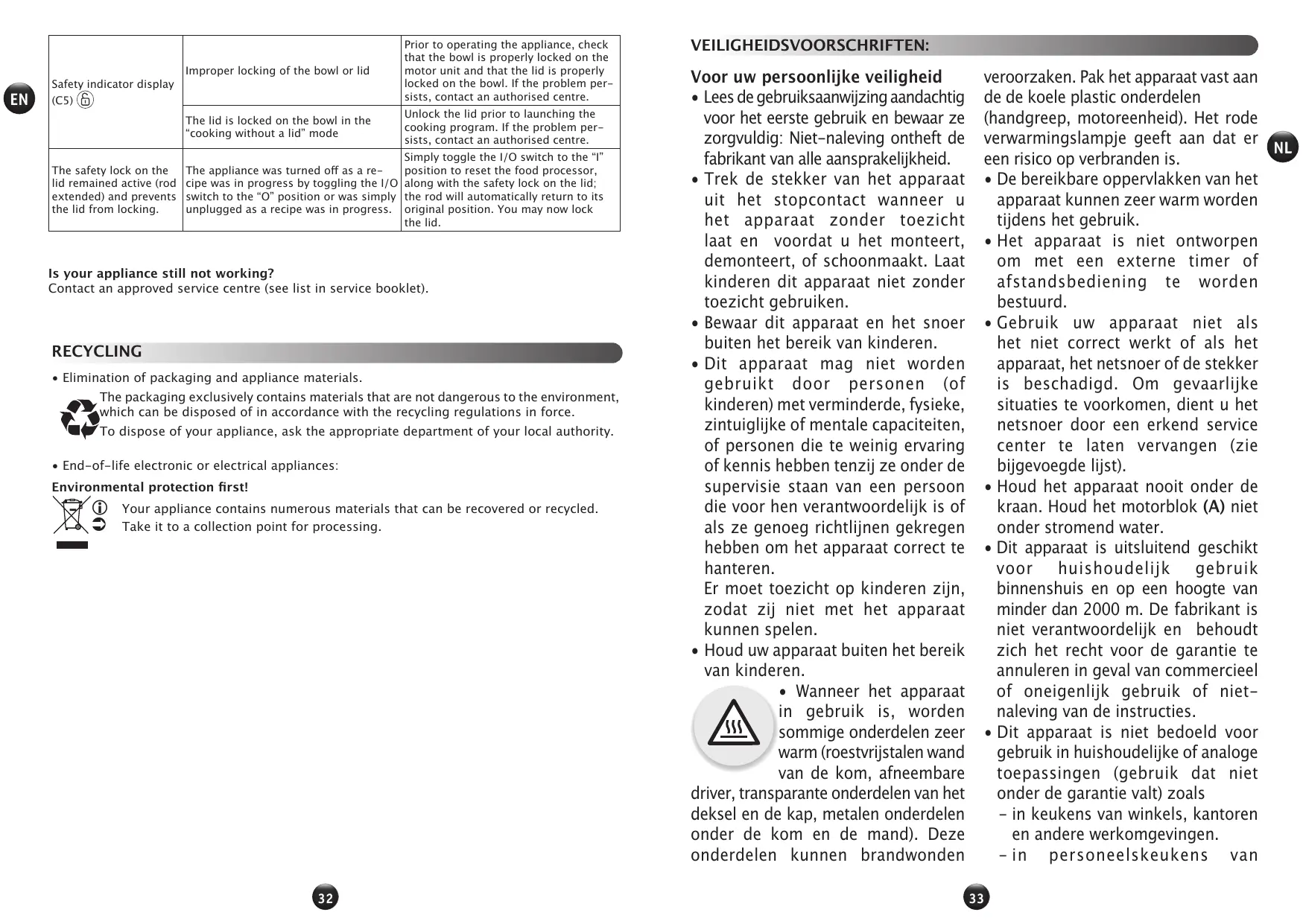 niet gebruikt kan worden. Als uw apparaat wordt uitgeschakeld en u de melding “SECU” ziet op het bedieningspaneel, neem dan onderstaande stappen: • Zorg ervoor dat uw apparaat ingeschakeld blijft, druk niet op de “0/1”-schakelaar. • R aadpleeg de richtlijnen van de gebruikshandleiding om uw bereiding aan te passen (zie de paragraaf “INGEBRUIKNAME”: hoeveelheid ingrediënten/bereidingstijd/ temperatuur/type accessoires). • Wacht een half uur om de motor te laten afkoelen.