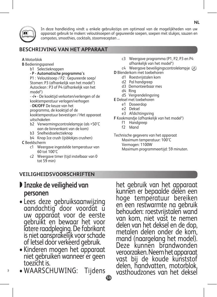 In deze handleiding vindt u enkele gebruikstips om optimaal van de mogelijkheden van uw apparaat gebruik te maken: veloutésoepen of gepureerde soepen, soepen met stukjes, sauzen en compotes, smoothies, cocktails, stoomrecepten ...