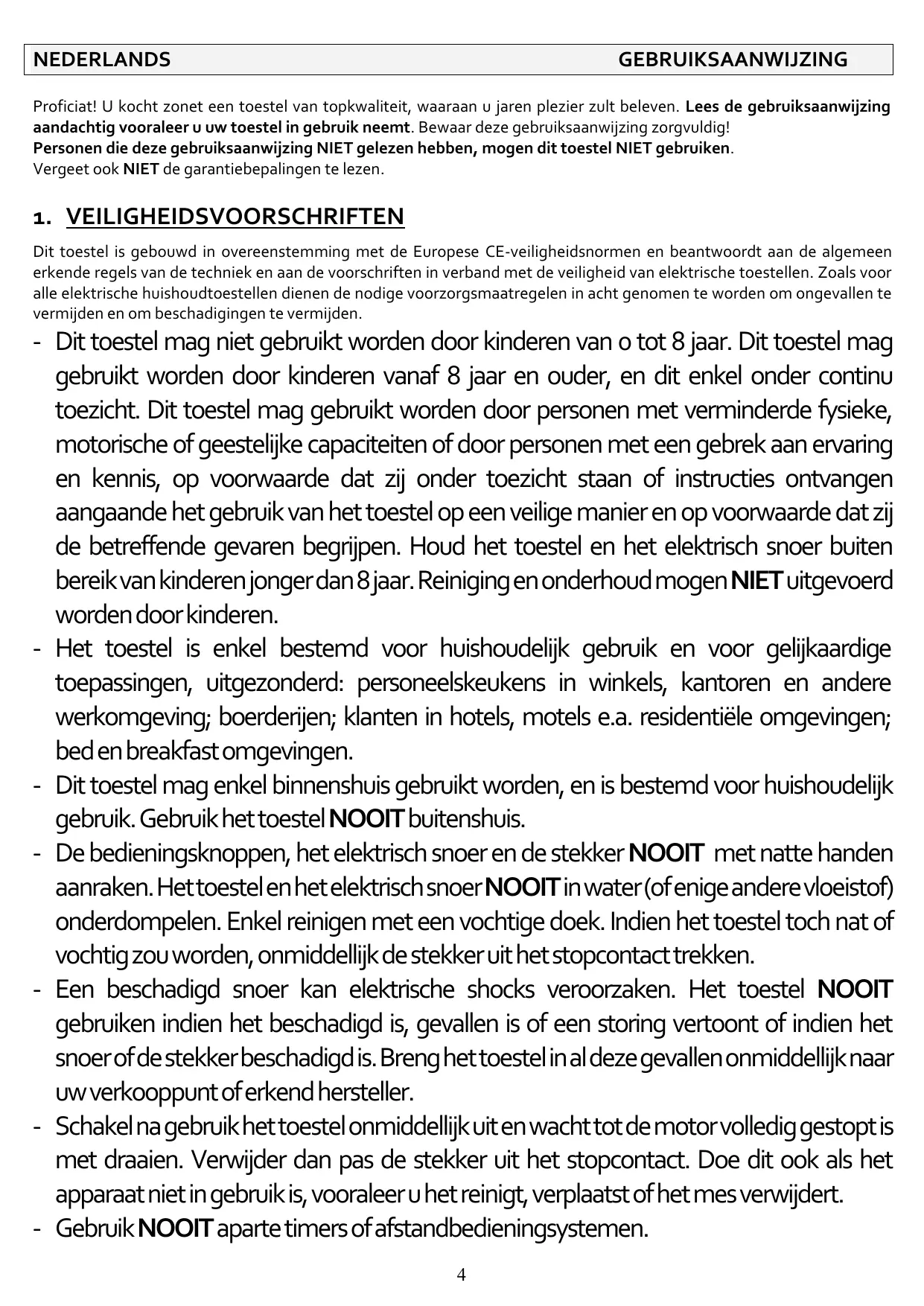 Cet appareil peut être utilisé par des personnes dont les capacités physiques, sensorielles ou mentales sont réduites, ou par des personnes avec un manque de connaissance et d’expérience, à condition qu’elles soient surveillées ou reçoivent des instructions sur l’usage de l’appareil d’une façon sûre et à condition qu’elles soient au courant des dangers potentiels. Maintenez l’appareil et le cordon électrique hors de portée des enfants de moins de 8 ans. Le nettoyage et l’entretien ne peut pas se faire par des enfants. - L’appareil est destiné uniquement à un usage domestique et pour applications similaires, sauf: Cuisines du personnel de magasins, sociétés et autres environnements professionnels ; Fermes ; Par les clients d'hôtels, motels et autres types d'environnements résidentiels ; Tous types d'environnement bed & breakfast. - Cet appareil ne peut être utilisé qu’ à l’intérieur, et est conçu pour un usage domestique. - Ne touchez JAMAIS les boutons de commandes, le cordon électrique ou la prise avec des mains mouillées. N’immergez JAMAIS l’appareil, le cordon d’alimentation ni la fiche dans l’eau (ou tout autre liquide). Nettoyez-les uniquement avec un chiffon humide. Si l’appareil devient mouillé ou humide, retirez immédiatement la fiche de la prise. - Un cordon endommagé peut causer des chocs électriques. N’utilisez JAMAIS l’appareil s’il est endommagé, tombé, montre un dérangement ou si le cordon ou la prise est endommagé. Dans tous ces cas, l’appareil doit immédiatement être retourné chez un réparateur agréé. - Désactivez l’appareil et attendez jusqu’à ce que le moteur finit de tourner. Retirez la fiche de la prise après utilisation. Retirez-la également lorsque l’appareil n’est pas utilisé, avant de le nettoyer et lorsque vous le déplacez. - N’utilisez JAMAIS de minuteurs ou de systèmes à télécommande externes.