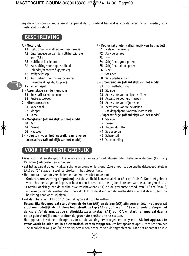 • Ramenez la tête multifonctions (A3) en position horizontale en appuyant de nouveau sur le bouton (A2). 3.2 - ASSEMBLAGE DE LA TETE HACHOIR • Prenez le corps (F1) par la cheminée en plaçant l’ouverture la plus large vers le haut. • Introduisez la vis (F2) (axe long en premier) dans le corps (F1). • Positionnez le couteau (F3) sur l’axe court qui dépasse de la vis (F2) en dirigeant les arêtes tranchantes vers l’extérieur. • Placez la grille choisie (F4 ou F5) sur le couteau (F3) en faisant correspondre les deux ergots avec les deux encoches du corps (F1). • Vissez fortement l’écrou (F6) sur le corps (F1) dans le sens horaire, sans toutefois le bloquer. • Vérifiez le montage. L’axe ne doit ni avoir de jeu, ni pouvoir tourner sur lui-même. Dans le cas contraire, recommencez les opérations précédentes. 3.3 - MISE EN PLACE DE LA TETE HACHOIR SUR L’APPAREIL • Présentez la tête hachoir assemblée (F) inclinée vers la droite, face à la sortie de l’adaptateur (E), faites correspondre les deux baïonnettes de la tête hachoir avec les deux encoches de l’adaptateur. Engagez à fond la tête hachoir dans l’adaptateur puis ramenez la cheminée de la tête hachoir à la verticale jusqu’au blocage en tournant dans le sens antihoraire. • Placez le plateau amovible (F8) sur la cheminée. 3.4 - MISE EN MARCHE, CONSEILS ET DEMONTAGE • Assurez-vous que la trappe de sécurité (A5) est bien verrouillée (sens horaire) sur la sortie rapide (A4). • Placez un récipient pour recueillir la préparation devant l’appareil. • Mettez en marche en tournant le variateur (A1) sur la vitesse « 3 » ou « 4 ». • Introduisez la viande dans la cheminée morceau par morceau à l’aide du poussoir (F7). Ne poussez jamais l’ingrédient avec les doigts ou avec des ustensiles dans la cheminée. - Vous pouvez hacher jusqu'à 3 kg de viande. - Temps maximum d'utilisation: 10 minutes. • Laissez refroidir complètement votre appareil avant toute nouvelle utilisation. • Pour arrêter l’appareil, tournez le variateur sur la vitesse « 0 » et attendez l’arrêt complet de l’appareil. • Déverrouillez la tête hachoir dans le sens inverse du montage. Conseils : - Préparez toute la quantité d’aliments à hacher (pour la viande, éliminez les os, cartilages et nerfs et coupez-la en morceaux de 2x2 cm environ). - Assurez-vous que votre viande soit bien décongelée. - En fin d’opération, vous pouvez faire passer quelques petits morceaux de pain afin de faire sortir tout le hachis.