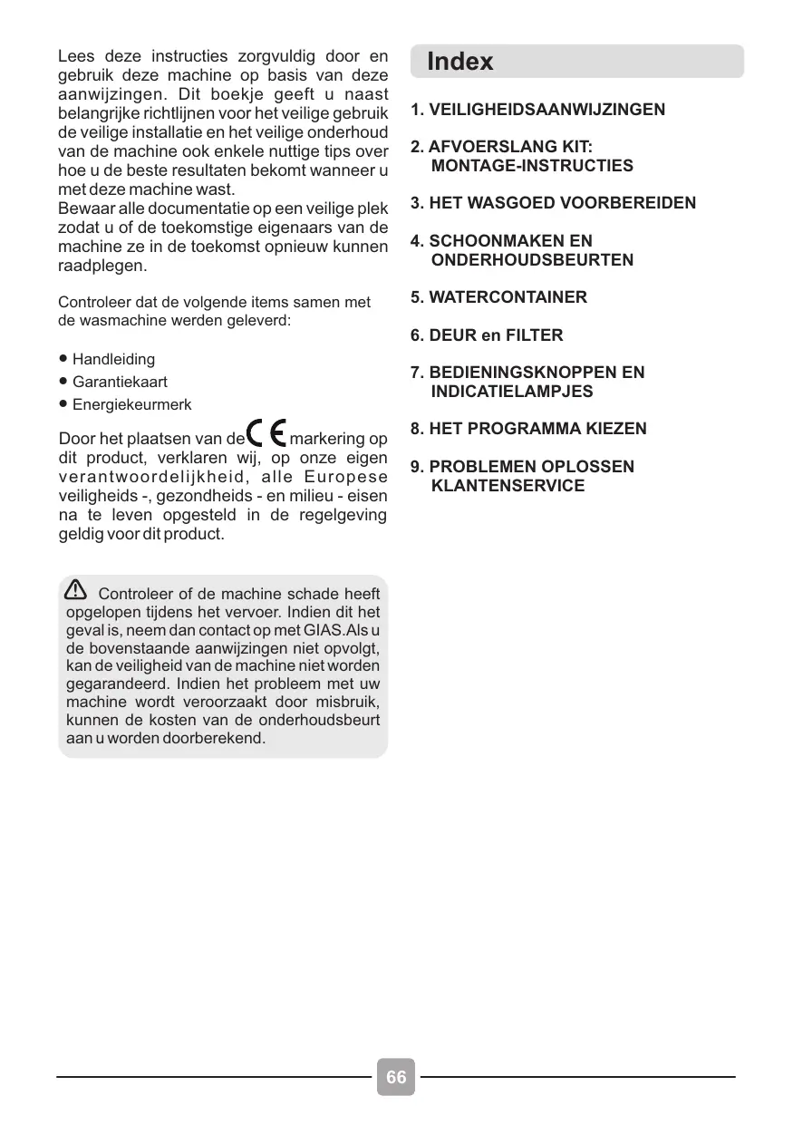 ● Carte de garantie ● Étiquette d'énergie Vérifiez que la machine ne s'est pas détériorée en transit. Si c'est le cas, contactez GIAS pour une opération de dépannage. Le non-respect de ces instructions peut compromettre la sécurité de votre appareil. Un appel de service peut vous être facturé si la défaillance de votre appareil est causée par une mauvaise utilisation.