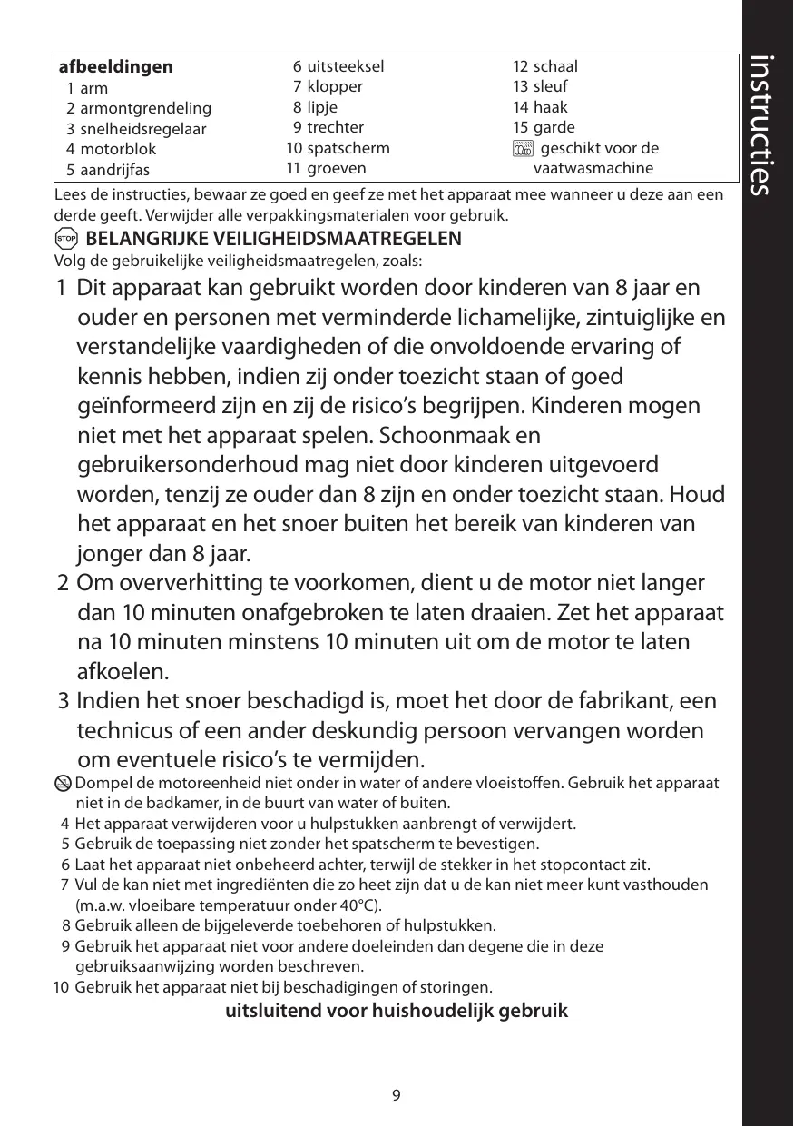 4 Débranchez l’appareil avant d’adapter ou de retirer les accessoires. 5 N'utilisez pas l'appareil sans installer la protection anti-éclaboussures. 6 Ne laissez pas l’appareil sans surveillance lorsqu’il est branché. 7 Ne remplissez pas avec quelque chose de trop chaud qui n’est plus agréable au toucher pour vous (par ex. températures des liquides inférieures à 40°C). 8 N’adaptez pas d’accessoires autres que ceux fournis. 9 N’utilisez pas l’appareil à d’autres fins que celles décrites dans ce mode d’emploi. 10 N’utilisez pas l’appareil s’il est endommagé ou ne fonctionne pas correctement.